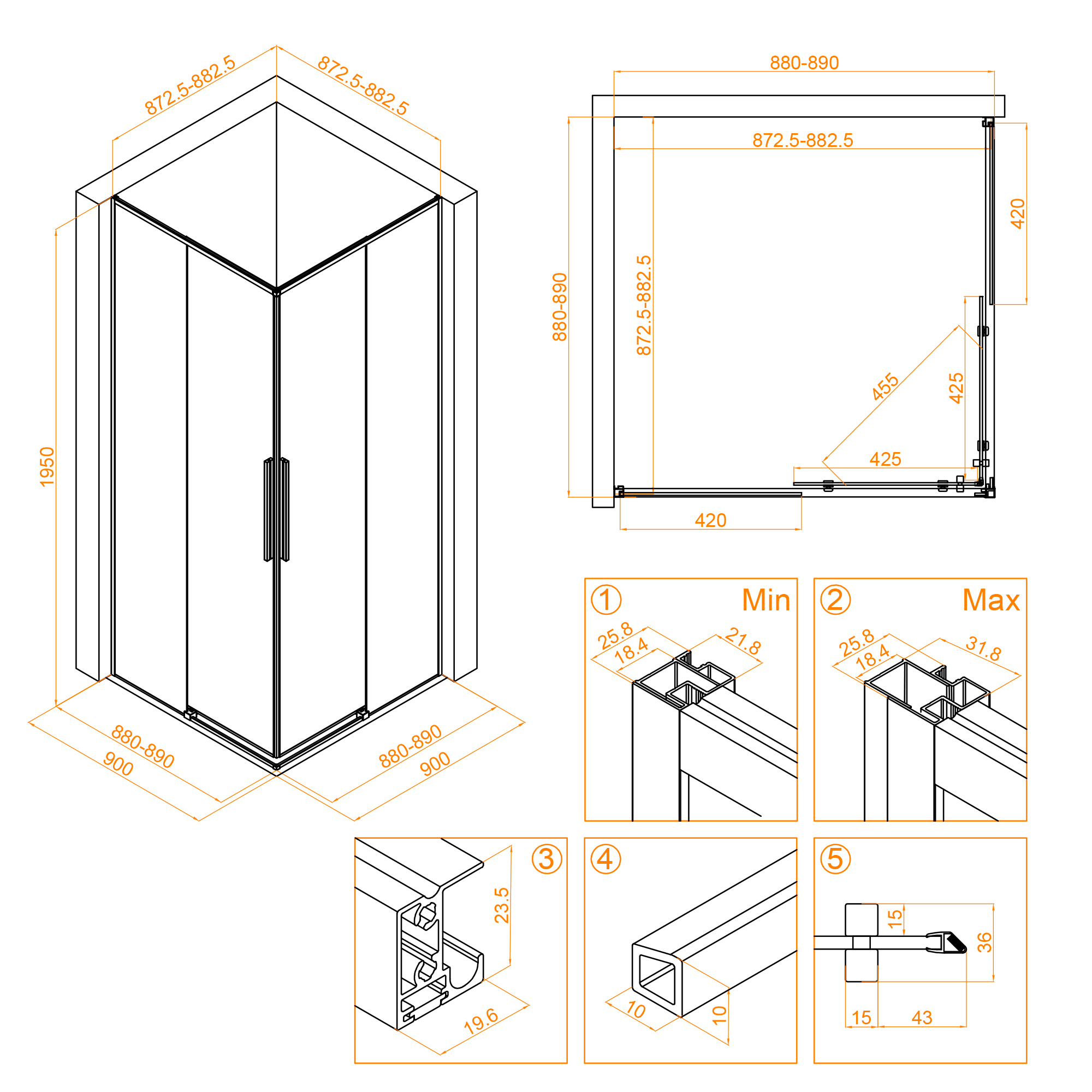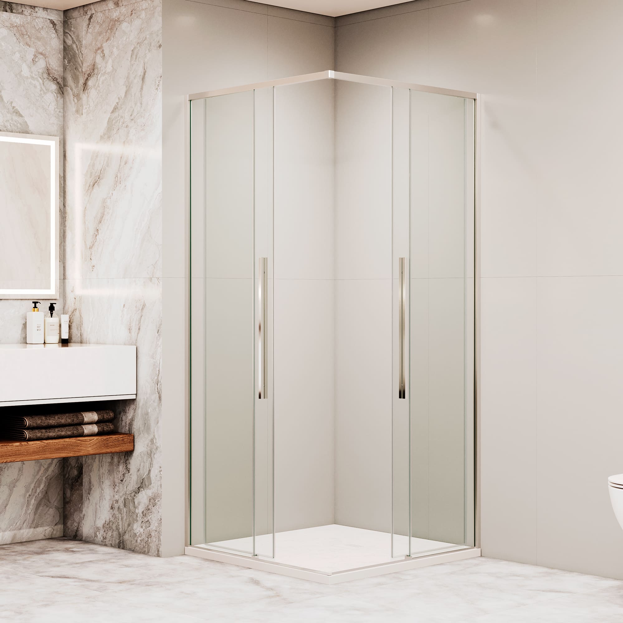 Душевой уголок квадратный, две раздвижные двери с угла. Трап или поддон приобретается отдельно.