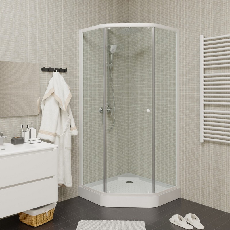 За счет трапециевидной формы модель занимает мало места, но внутри комфортно принимать душ.