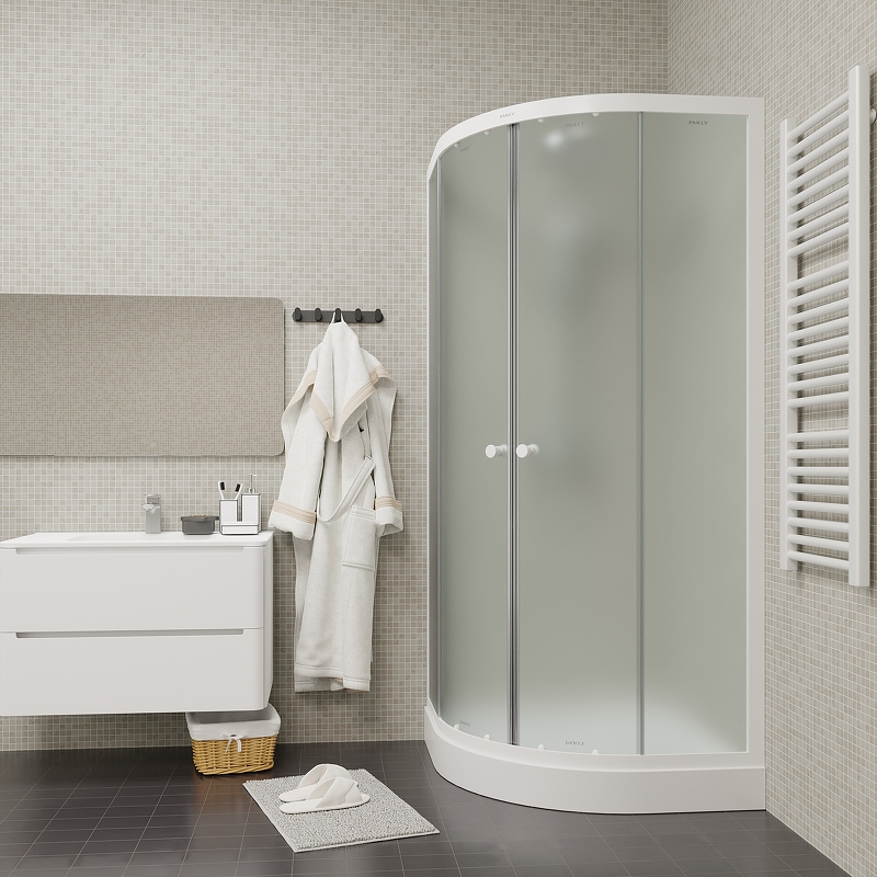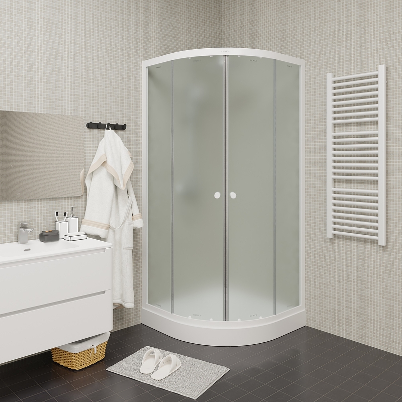 Уголок из матового стекла и белого алюминиевого профиля лаконично впишется практически в любое оформление ванной комнаты. Модель практична. На матовом стекле не видны разводы от воды, полотно легко чистить.