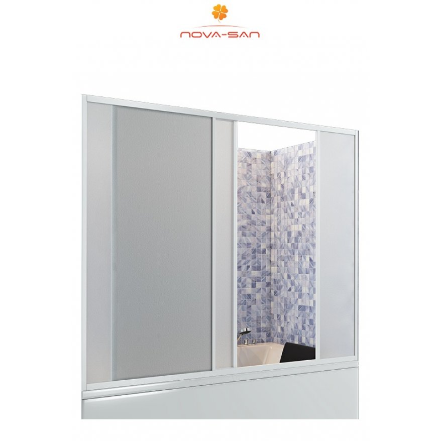 Шторка на ванну «Nova-San N-BE-170/150». Белый цвет алюминиевого профиля. Исполнение дверей и стенок: пластик (полипропилен) РР матовый. Высокопрочный экологически чистый пластик. Фронтальная часть: две неподвижные стенки и центральная подвижная дверь. Шторка с широким входом. Удобный вертикальный водонепроницаемый профиль-ручка на дверь. Крепление вертикальных боковых профилей шторки к стенкам ванной комнаты. Легкий и надежный ход двери шторки осуществляется оригинальным механизмом «ползунок».