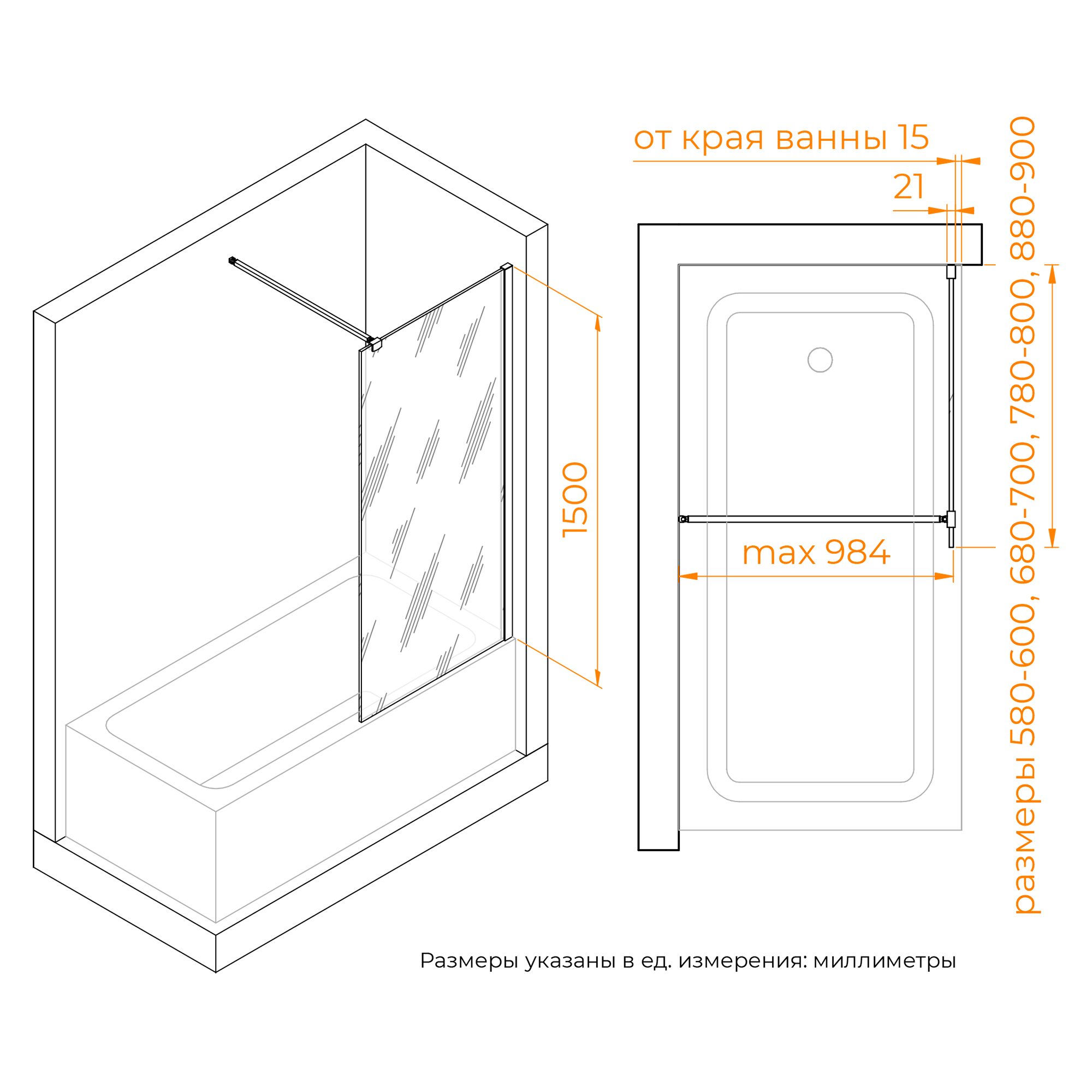 Шторка на ванну неподвижная. Верхняя стойка-держатель длиной – 1200 мм.