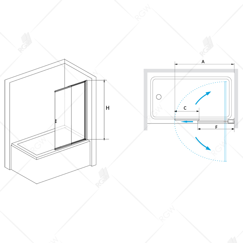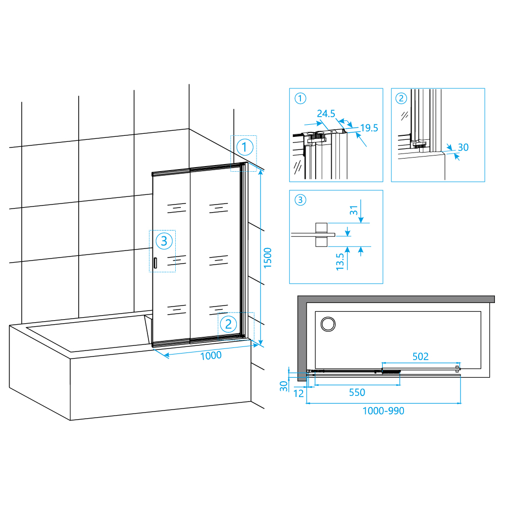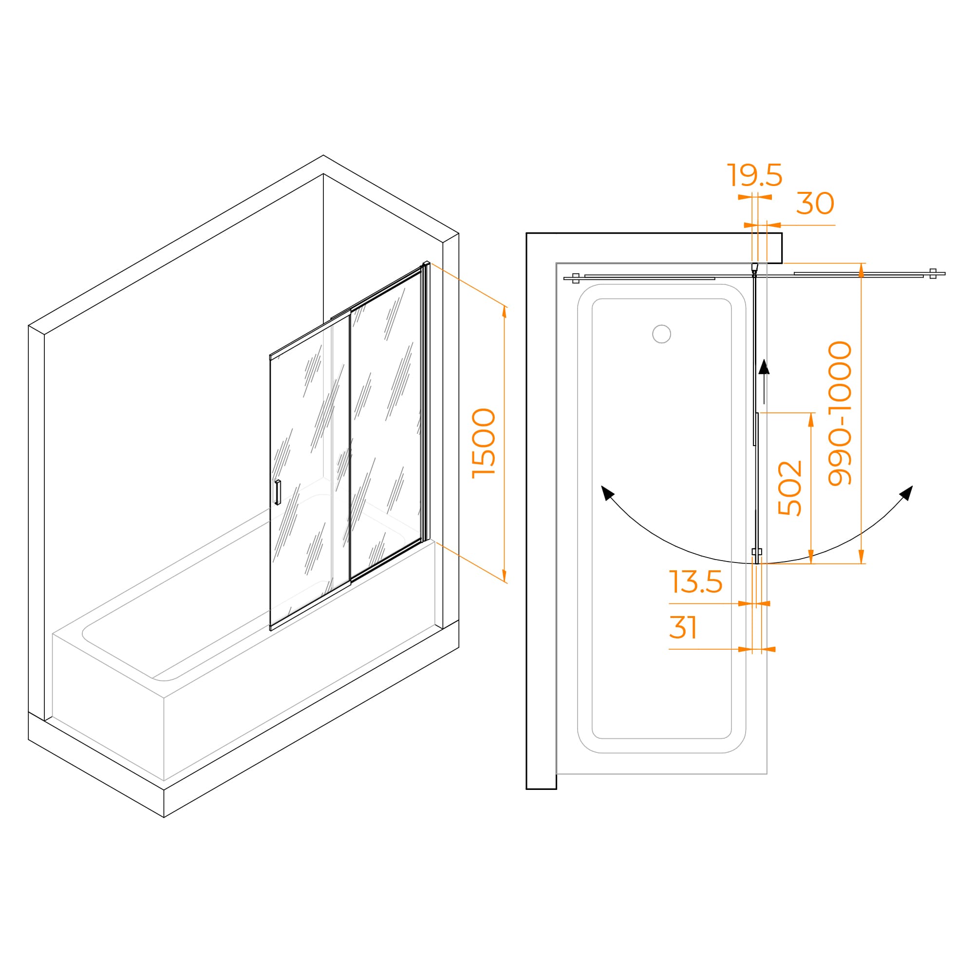 Шторка на ванну, сдвижная дверь маятниковая. Толщина закаленного, безопасного стекла 4 мм. Стекло сдвигается от 600 мм до 1000 мм. В комплекте порог душевого ограждения.