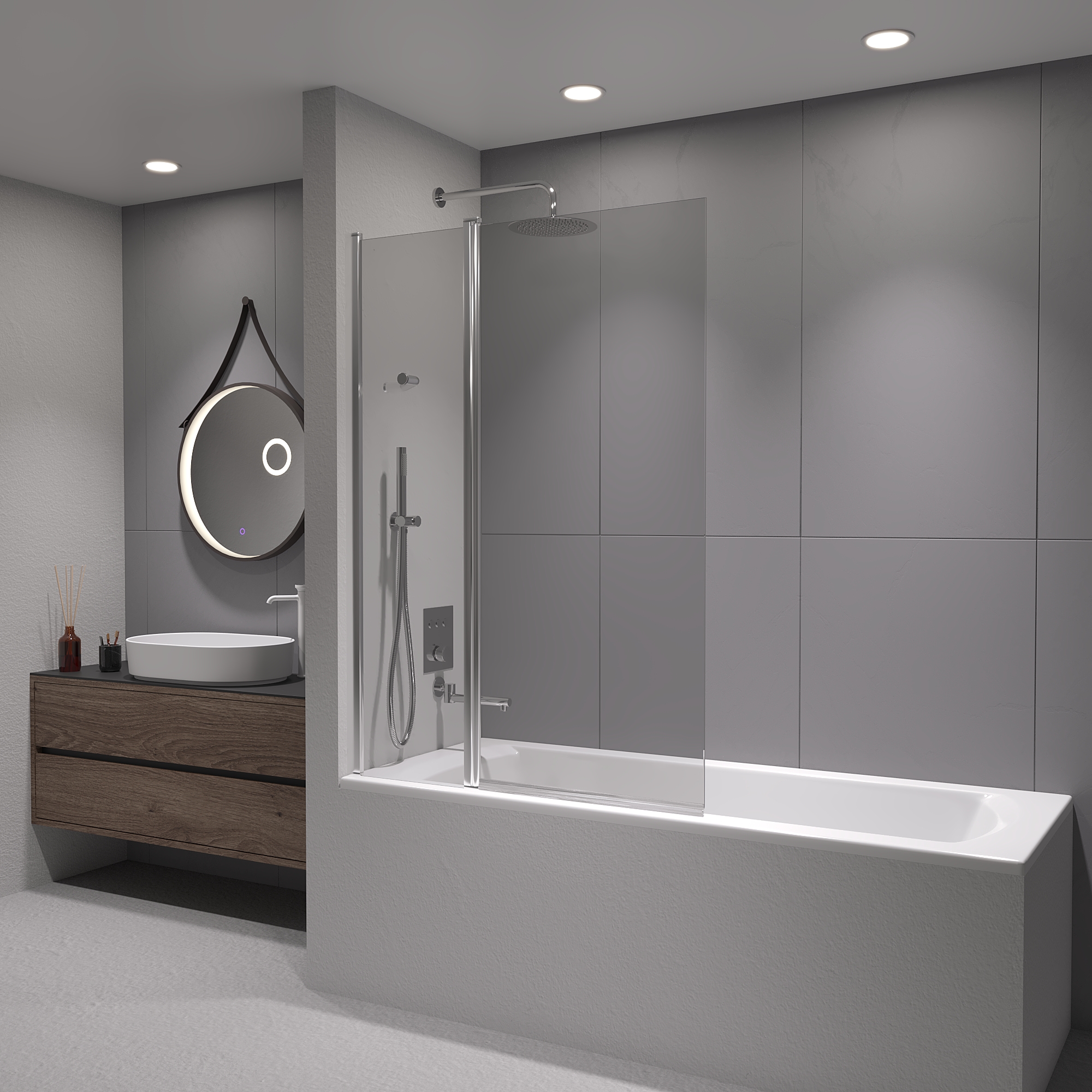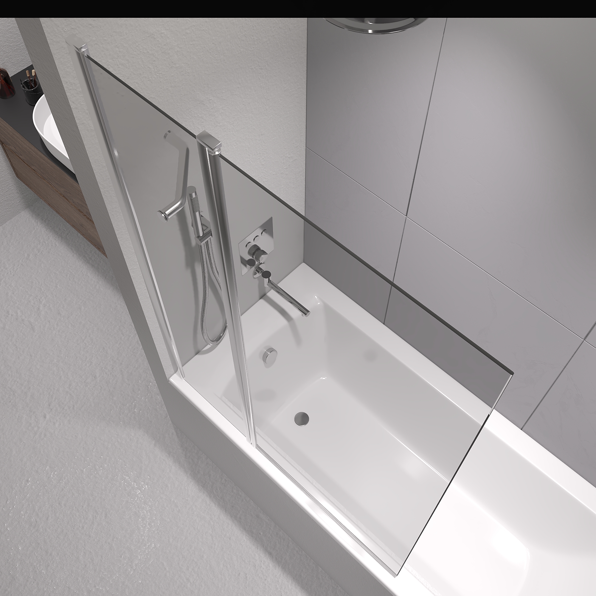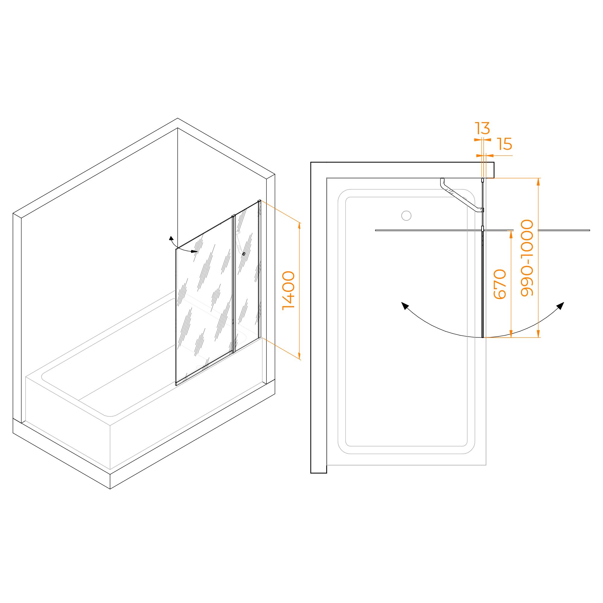 Шторка на ванну маятниковая. Толщина закаленного безопасного стекла 6 мм. Стационарное стекло + подвижное стекло.