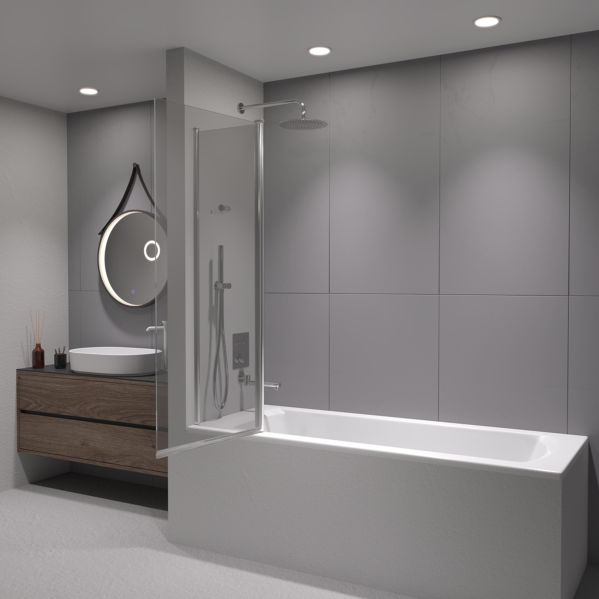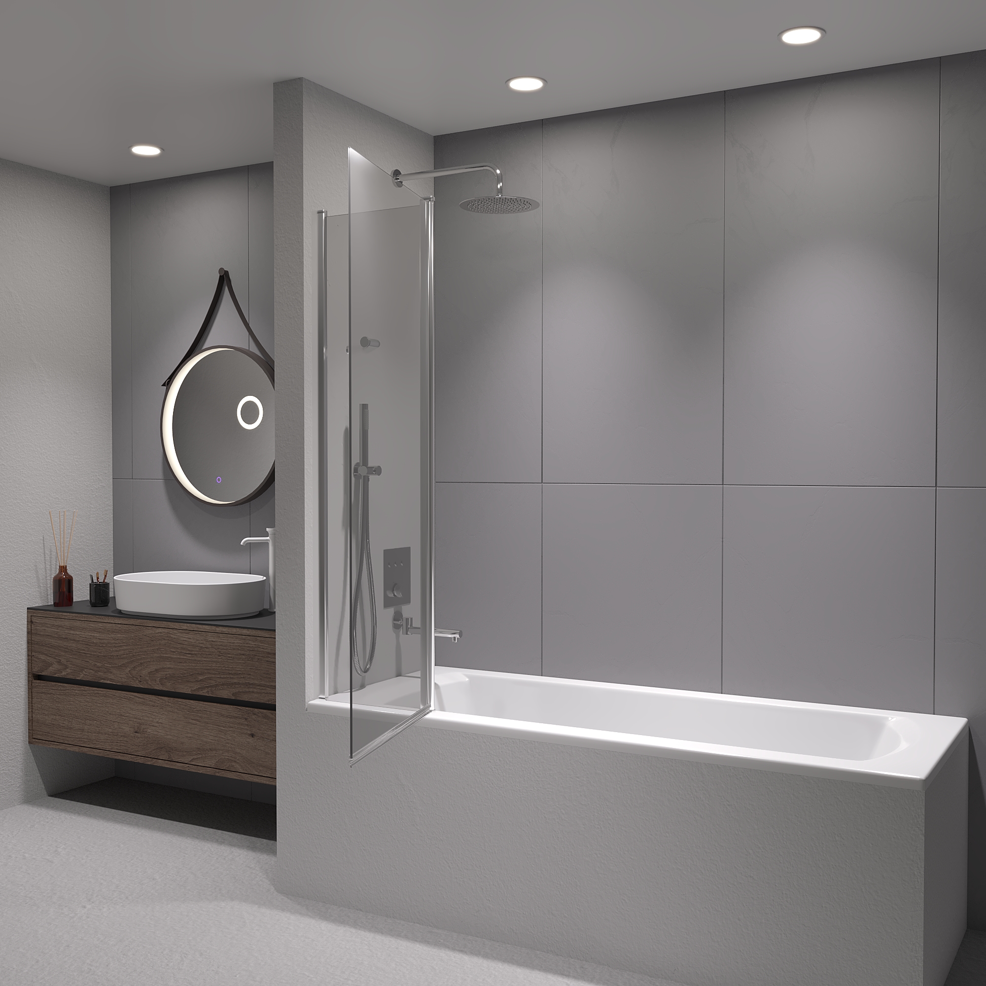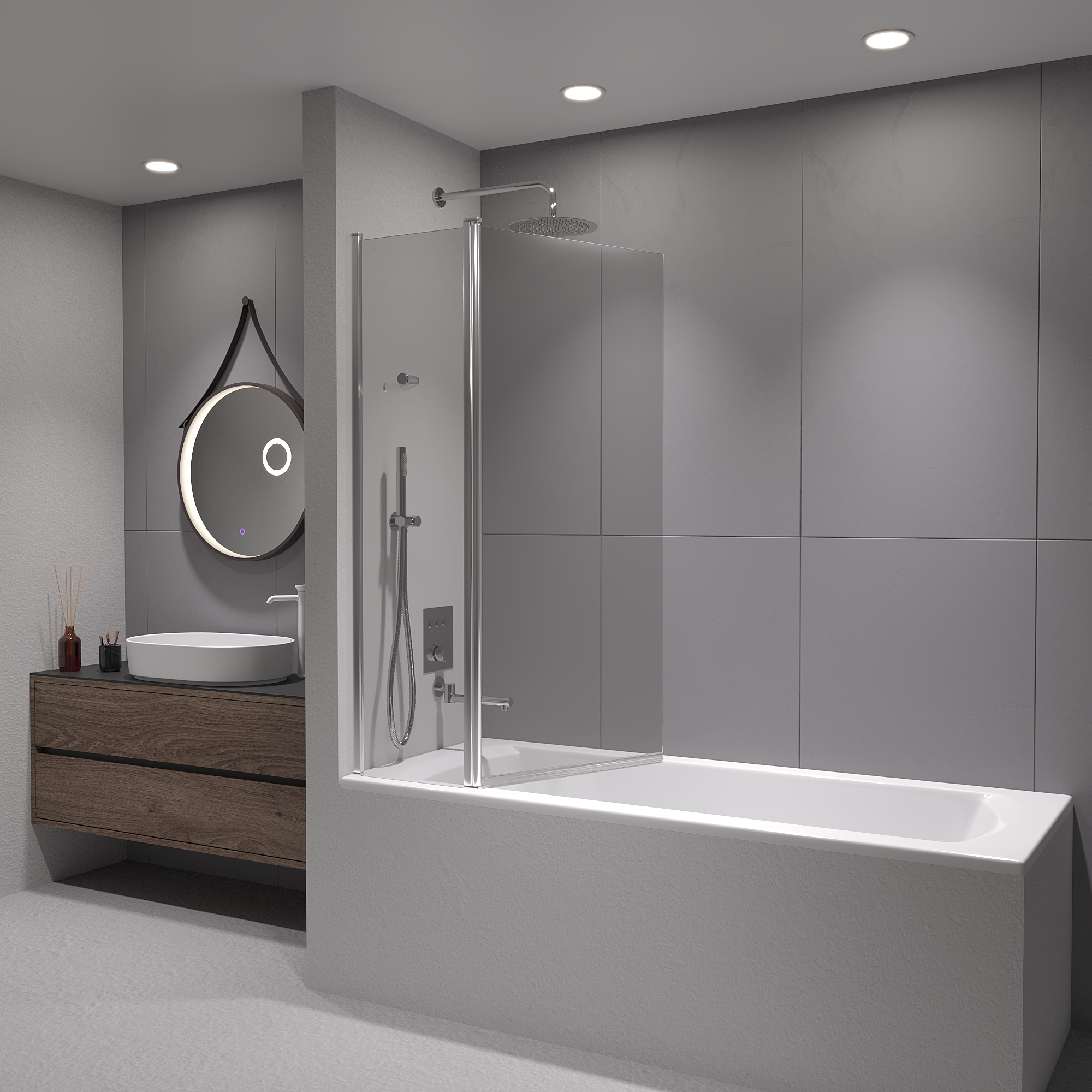 Шторка на ванну маятниковая. Толщина закаленного безопасного стекла 6 мм. Стационарное стекло + подвижное стекло.