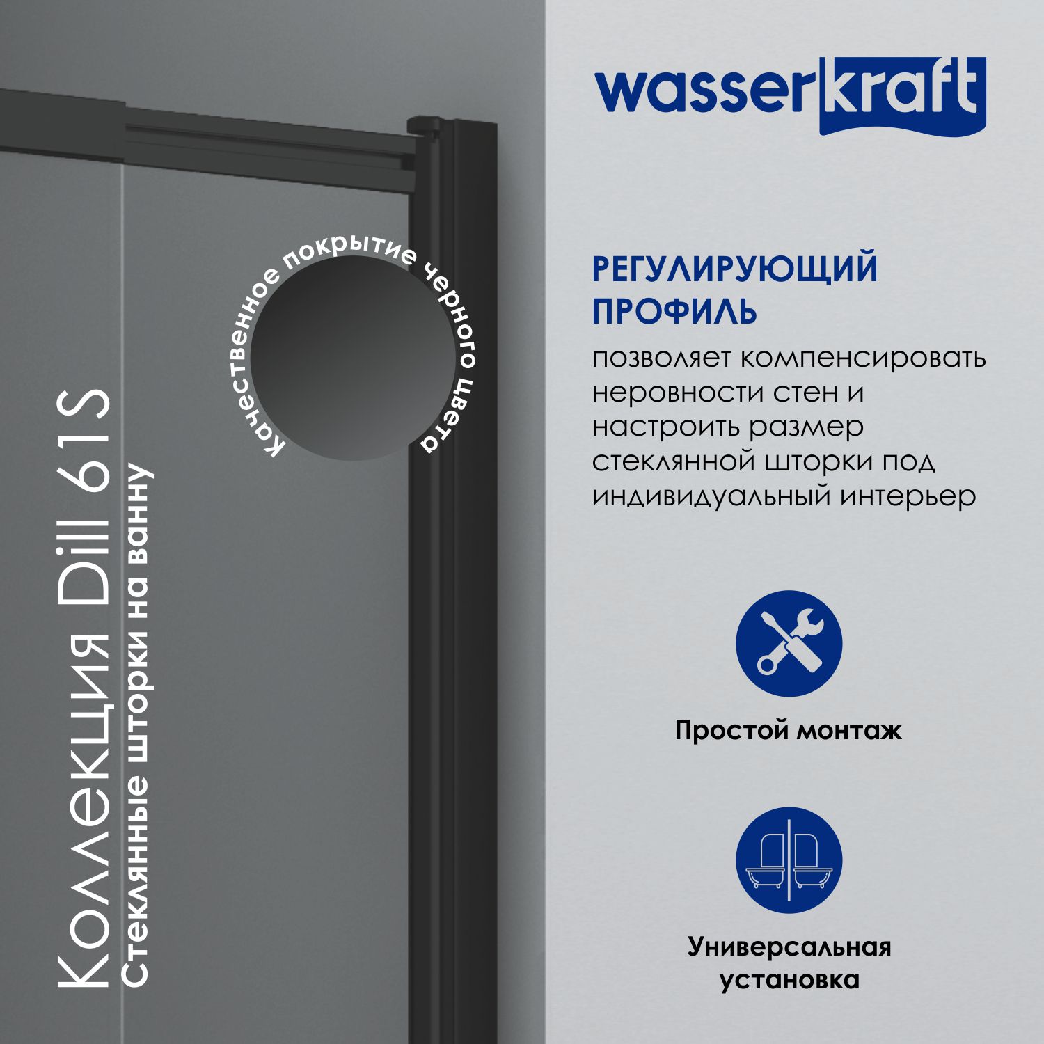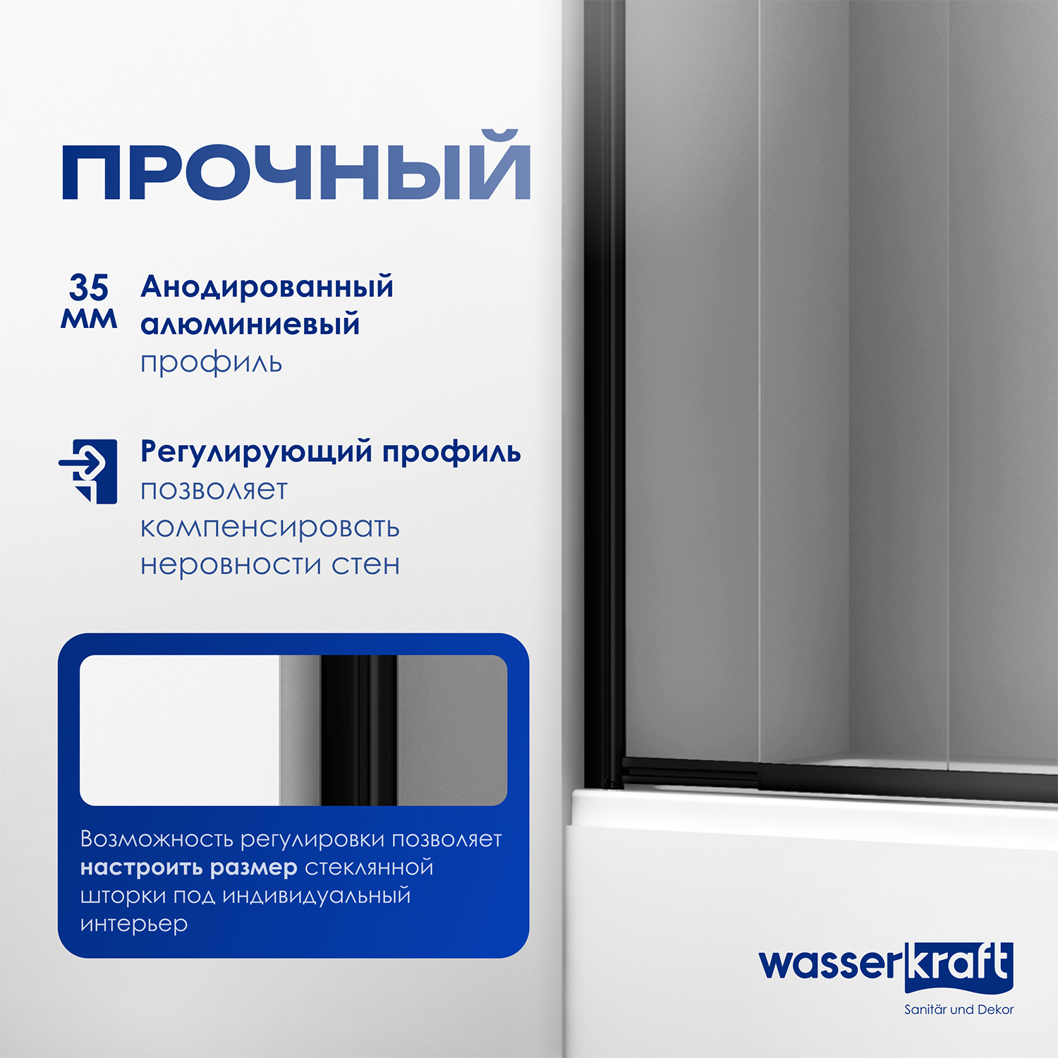 - Регулирующий профиль до 15 мм. Возможность регулировки профиля позволяет компенсировать неровности стен и настроить размер стеклянной шторки под индивидуальный интерьер.
