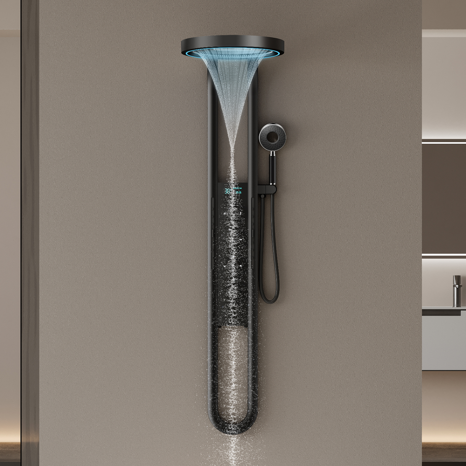 Цифровой дисплей : LED-экран в реальном времени показывает температуру воды (цифрами и цветовой индикацией) и время, проведённое в душе