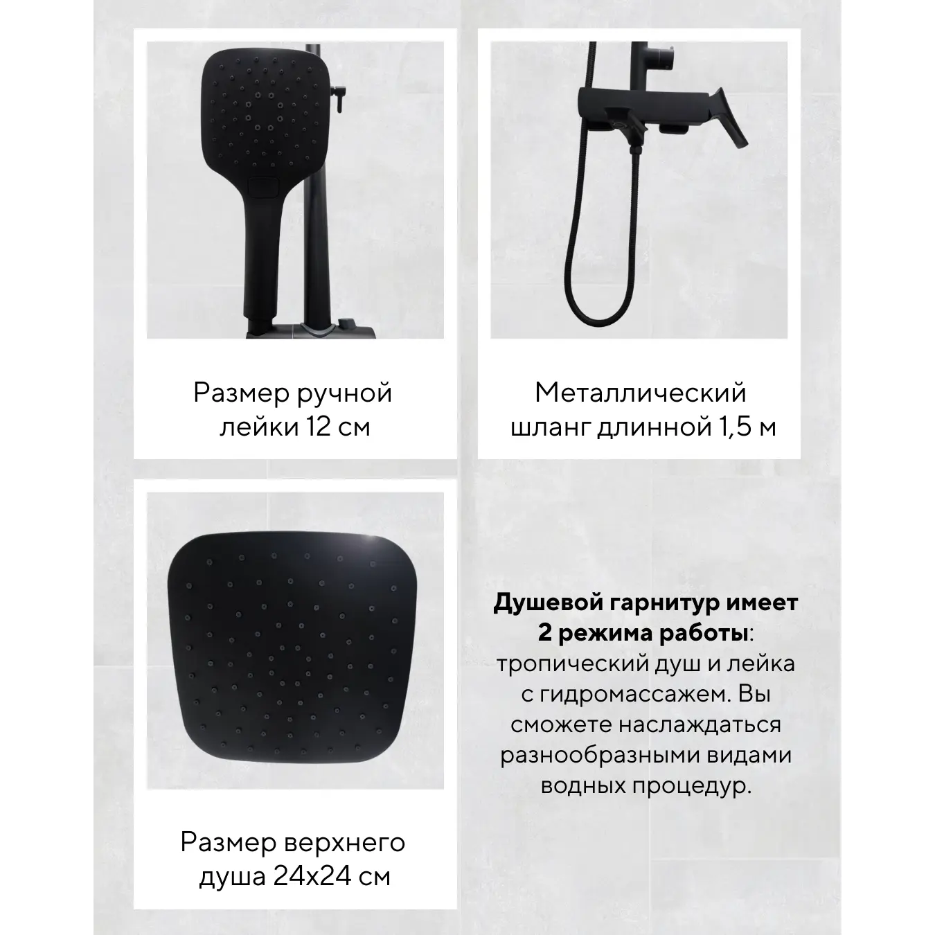 стильный дизайн и превосходное качество по доступной цене. Душевая стойка изготовлена из нержавеющей стали с латунными элементами, что обеспечивает долговечность товара и защищает его от коррозии и повреждений. Черное матовое покрытие делает душевой комплект привлекательным и соответствующим современным трендам дизайна ванных комнат. Душевой гарнитур имеет 2 режима работы: тропический душ, лейка с гидромассажем и вы сможете наслаждаться разнообразными видами водных процедур.