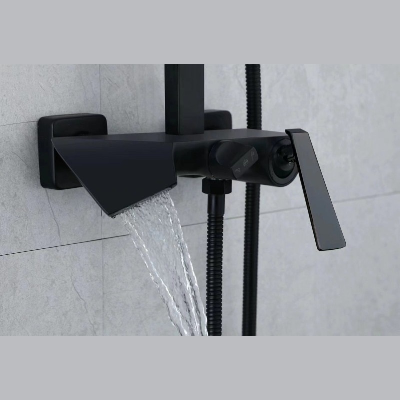 Стильная современная душевая система для подключения к смесителю для ванны с квадратной лейкой "Тропический дождь" черно- матового цвета, имеет актуальный дизайн, проста в установке и использовании.