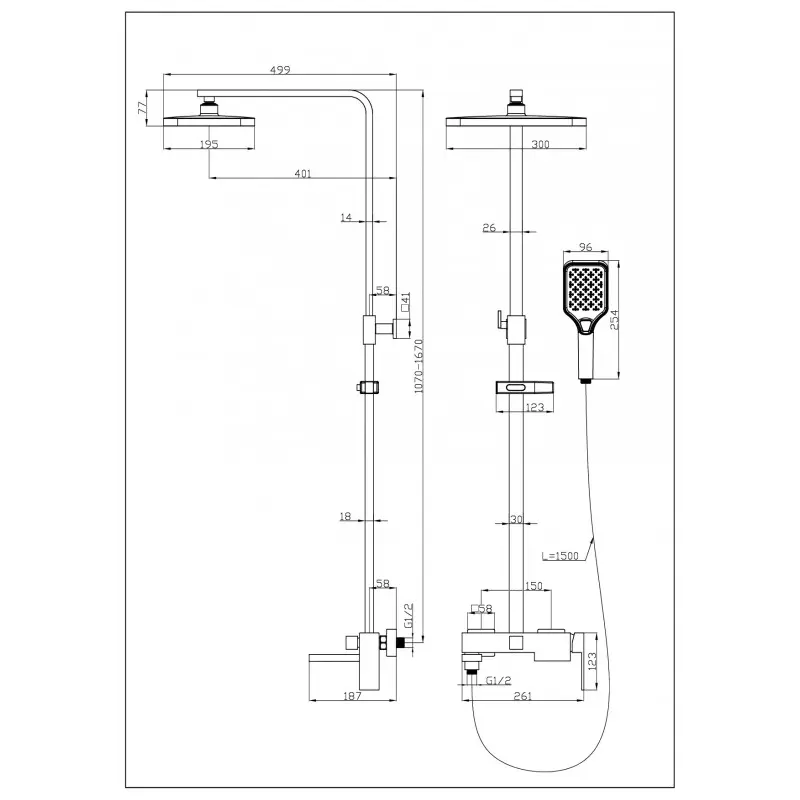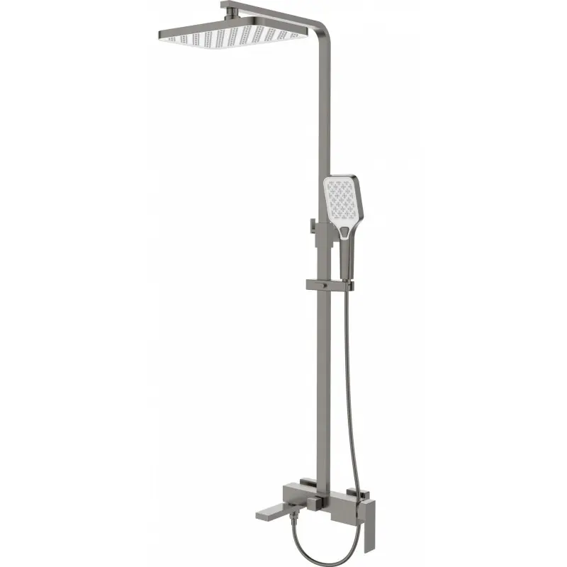 3-х режимная душевая система, телескопическая штанга (1070-1670), поворотный излив. Корпус смесителя - латунь. Надёжный керамический картридж. Излив - нержавеющая сталь (# 304). Верхний душ и душевая лейка из ABS. Душевой шланг: PVD. Длина шланга - 1,5 м.