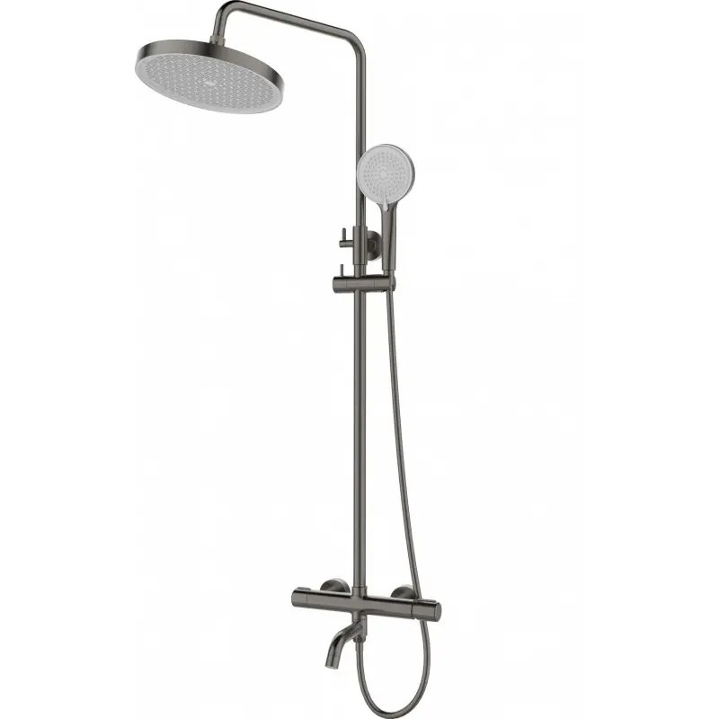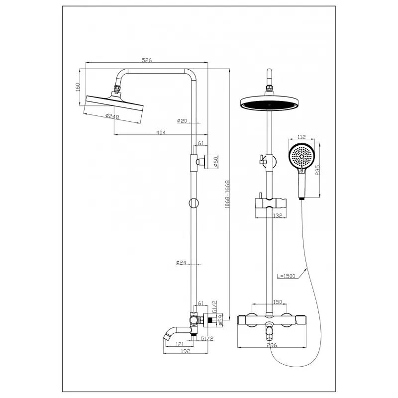 3-х режимная душевая система, телескопическая штанга (1068-1668), поворотный излив. Корпус смесителя - латунь. Надёжный керамический картридж. Излив - нержавеющая сталь (# 304). Верхний душ и душевая лейка из ABS. Душевой шланг: PVD. Длина шланга - 1,5 м.