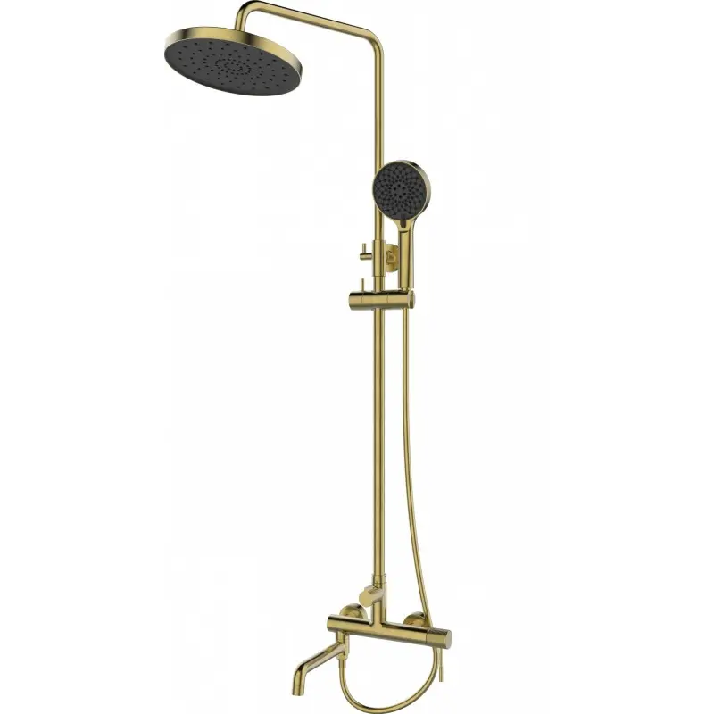 3-х режимная душевая система, телескопическая штанга (1150-1750), поворотный излив. Корпус смесителя - латунь. Надёжный керамический картридж. Излив - нержавеющая сталь (# 304). Верхний душ и душевая лейка из ABS. Душевой шланг: PVD. Длина шланга - 1,5 м.