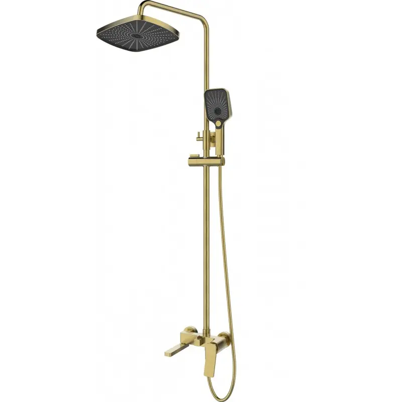 3-х режимная душевая система, телескопическая штанга (1070-1670), поворотный излив. Корпус смесителя - латунь. Надёжный керамический картридж. Излив - нержавеющая сталь (# 304). Верхний душ и душевая лейка из ABS. Душевой шланг: PVD. Длина шланга - 1,5 м.