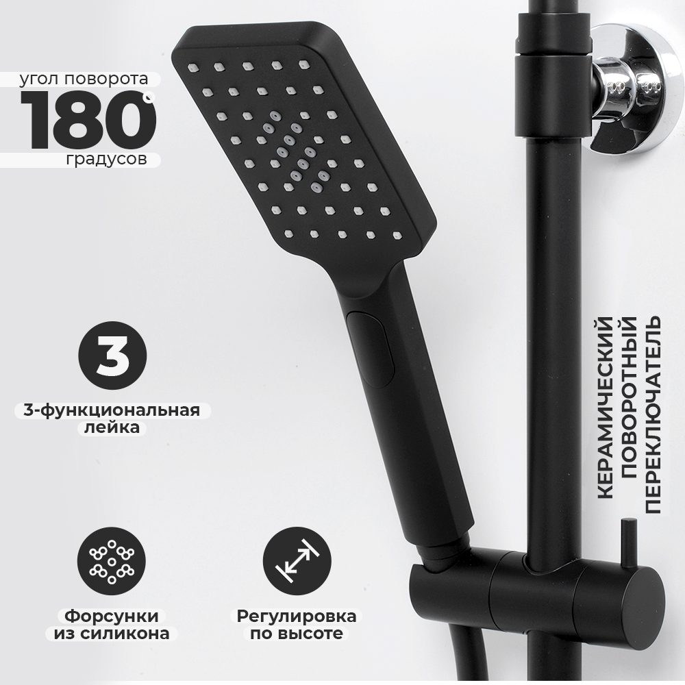 Дополнительно: Душевая насадка для комплекта производится из ABS-пластика. Форсунки из силикона с системой защиты от известковых отложений. Насадка крепится к штанге при помощи шарнирного соединителя, внутрь которого встроен сетчатый аэратор для равномерного распределения воды. Также шарнирный соединитель позволяет менять угол наклона душевой насадки от 0 до 22 градусов.