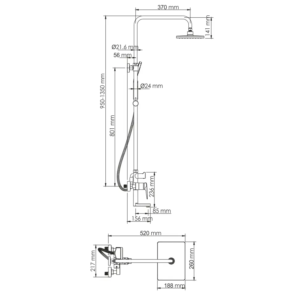 Регулируемая по высоте стойка. Стойку для душа можно регулировать по высоте. Для этого необходимо выдвинуть верхнюю часть стойки и зафиксировать на необходимой Вам высоте при помощи накидной гайки верхнего крепления.