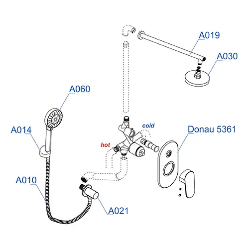 Смеситель для ванны и душа Donau 5361, Подключение шланга A021, Верхняя душевая насадка A030, Верхний излив для душа A019, Лейка 3-функциональная A060, Настенный держатель лейки, поворотный А014, Шланг для душа 1500 мм A010