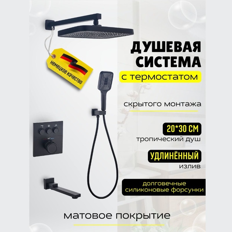 Набор для душа включает в себя тропический душ, ручной душ,термостатический смеситель с изливом.
