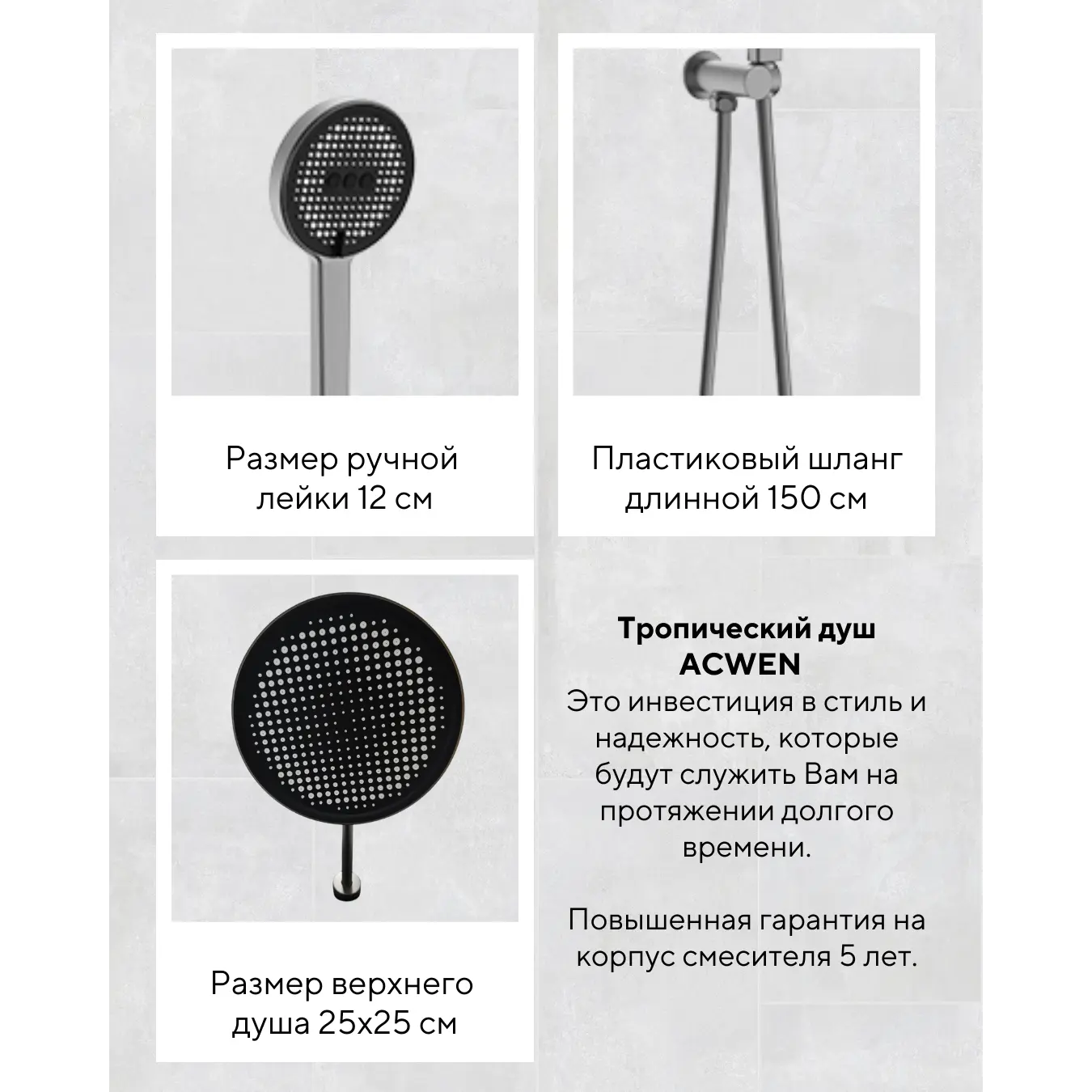 Тропический душ фирмы ACWEN - это инвестиция в стиль и надежность, которые будут служить Вам на протяжении долгого времени с повышенной гарантией на корпус смесителя 5 лет.