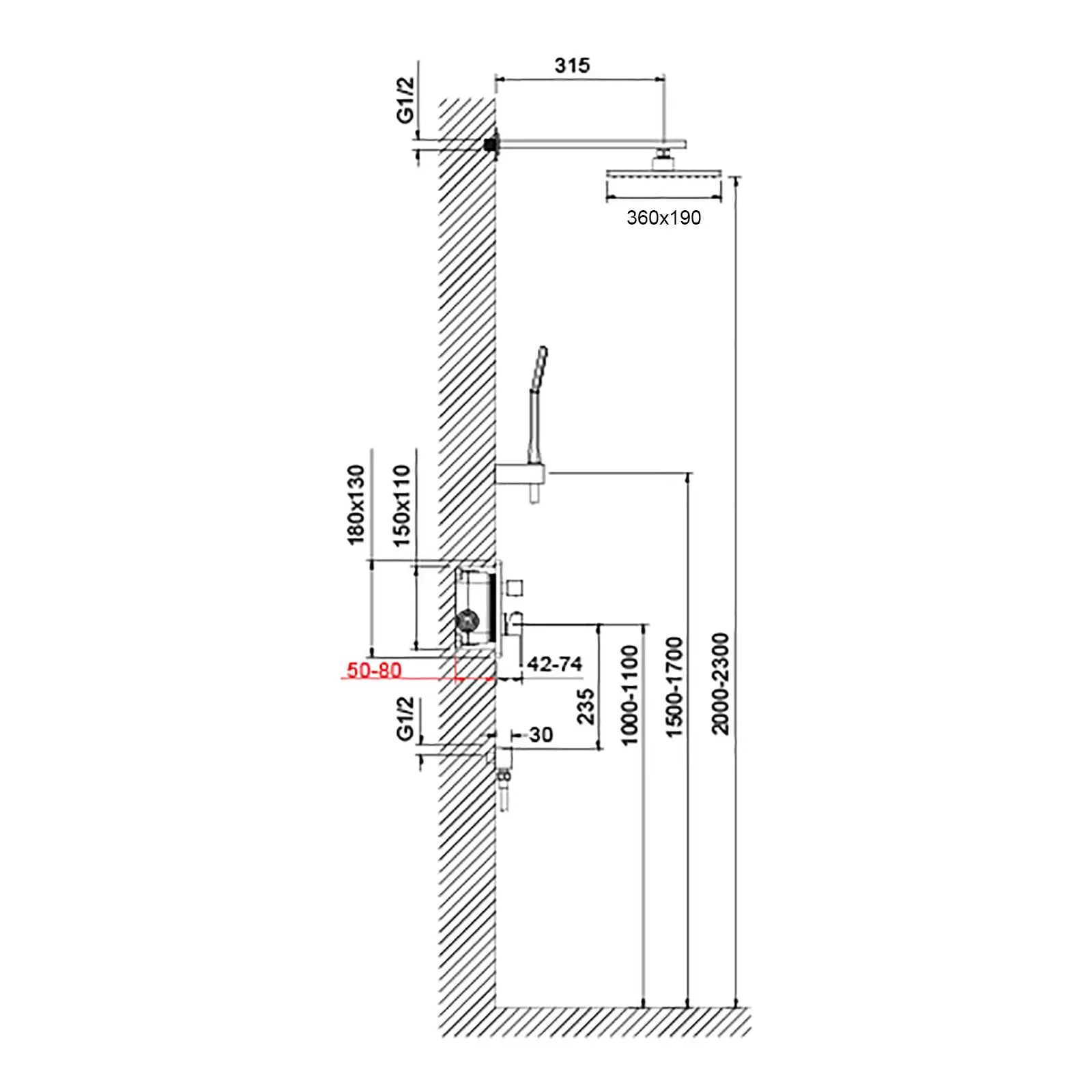 Смеситель скрытого монтажа с монтажной коробкой - 1 шт.Штанга тропического душа - 1 шт.