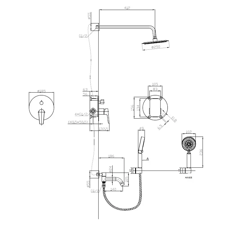 Смеситель встраиваемый, верхний душ, ручной душ со шлангом, штуцер с держателем, излив для ванны