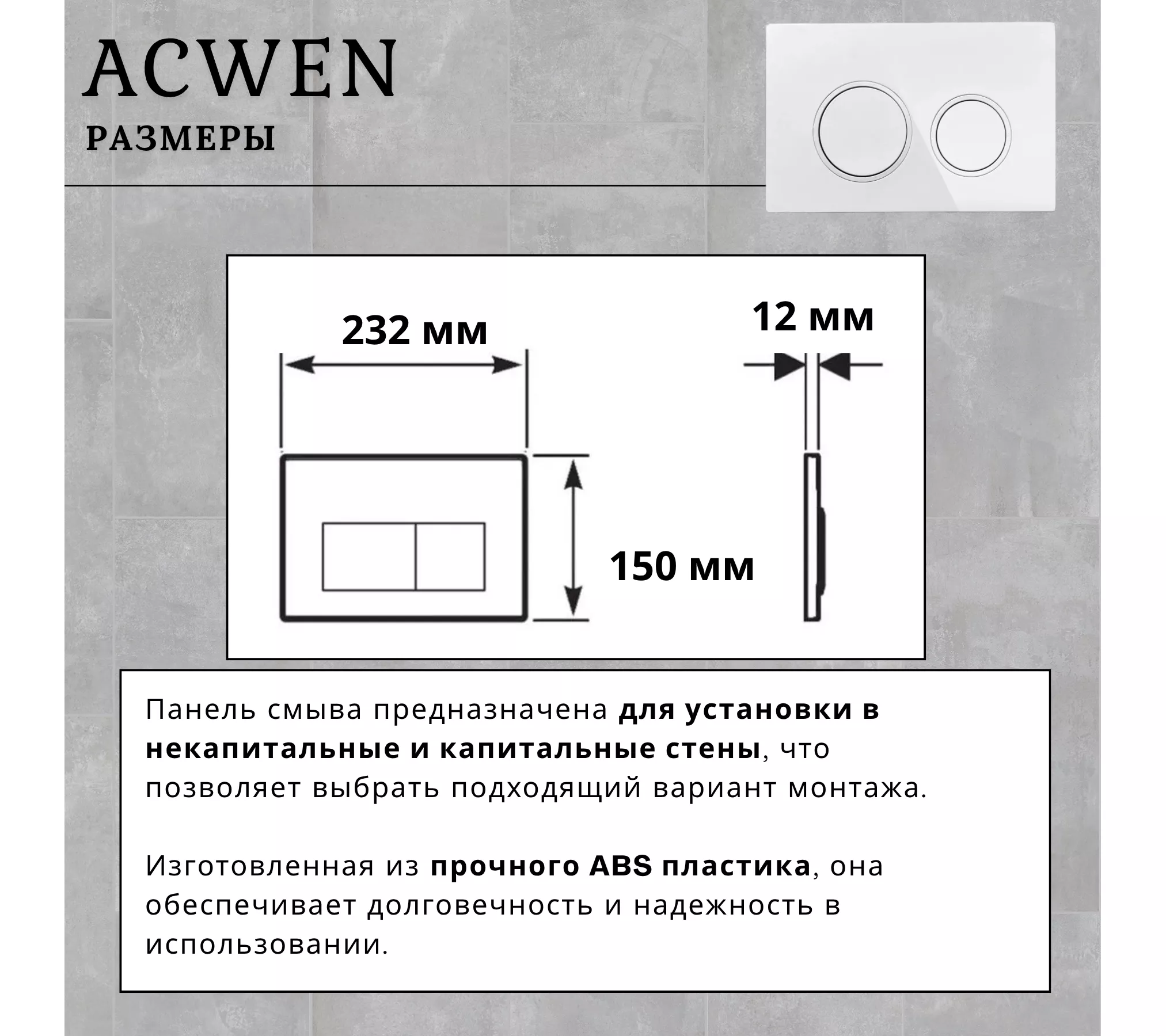 Панель смыва ACWEN с двумя клавишами  представляет собой стильное и функциональное решение для управления смывом унитаза. Изготовленная из прочного ABS пластика, она обеспечивает долговечность и надежность в использовании.