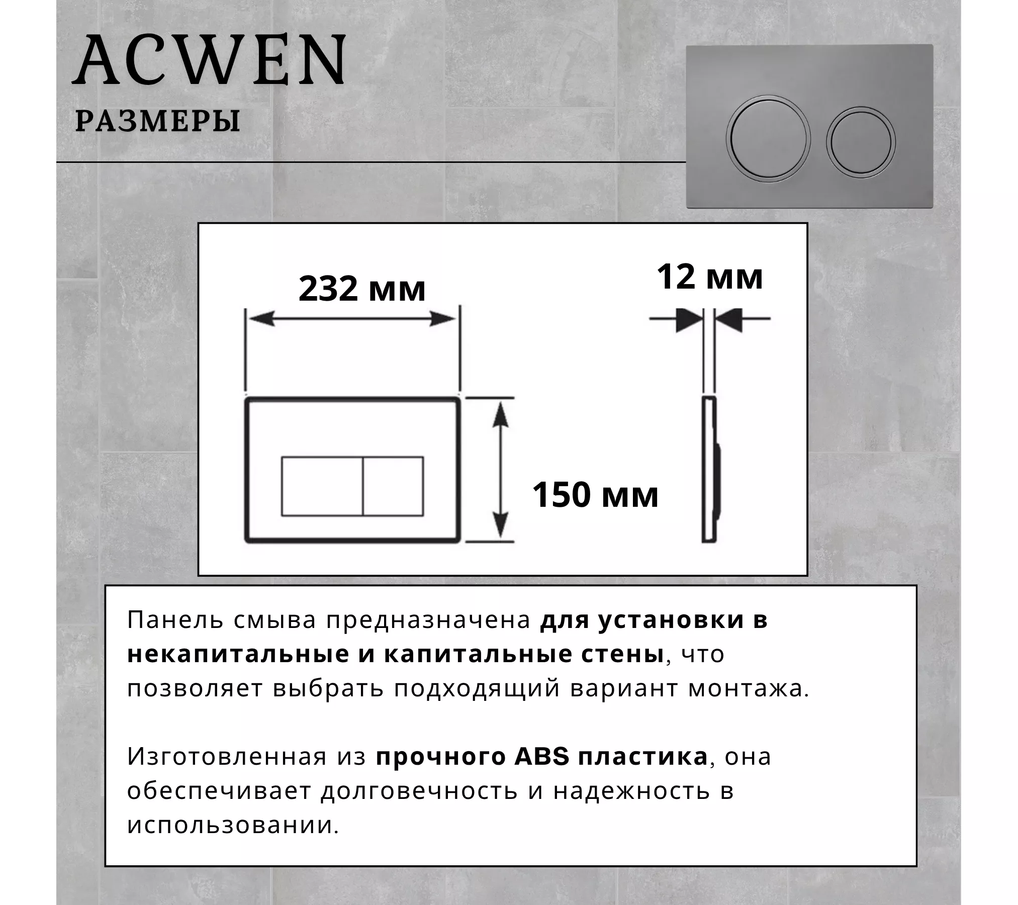 Панель смыва ACWEN с двумя клавишами  представляет собой стильное и функциональное решение для управления смывом унитаза. Изготовленная из прочного ABS пластика, она обеспечивает долговечность и надежность в использовании.