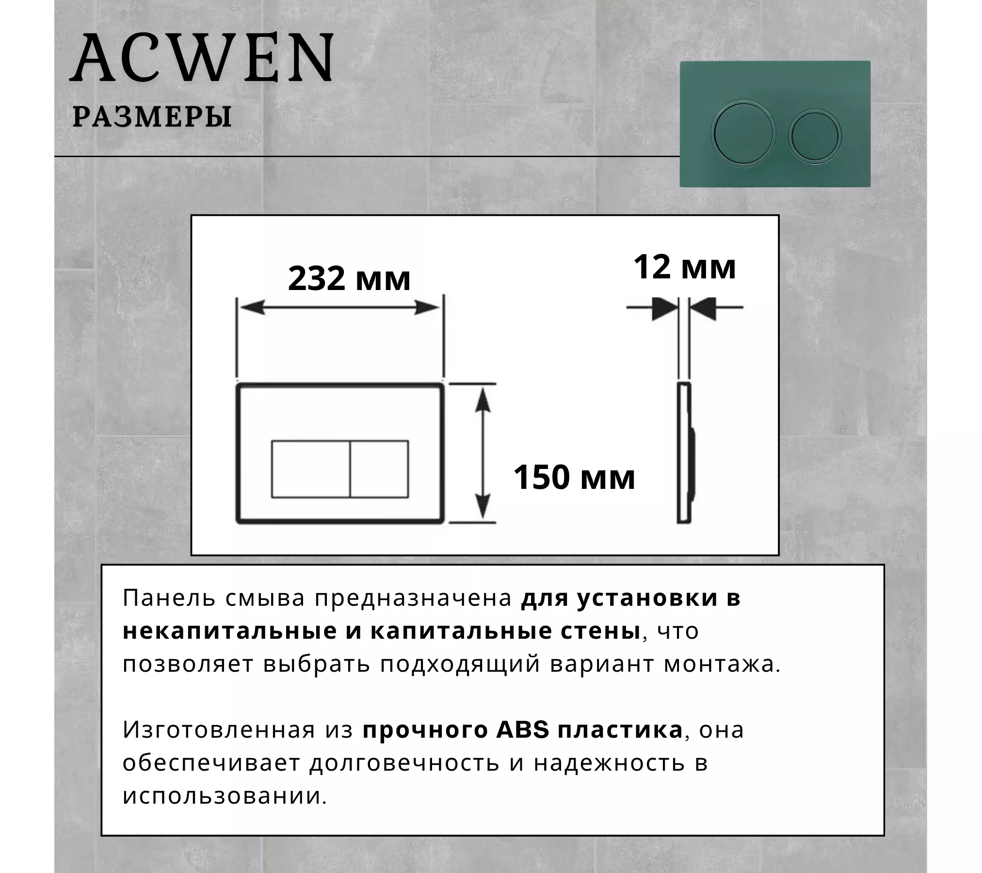 Панель смыва ACWEN с двумя клавишами  представляет собой стильное и функциональное решение для управления смывом унитаза. Изготовленная из прочного ABS пластика, она обеспечивает долговечность и надежность в использовании.