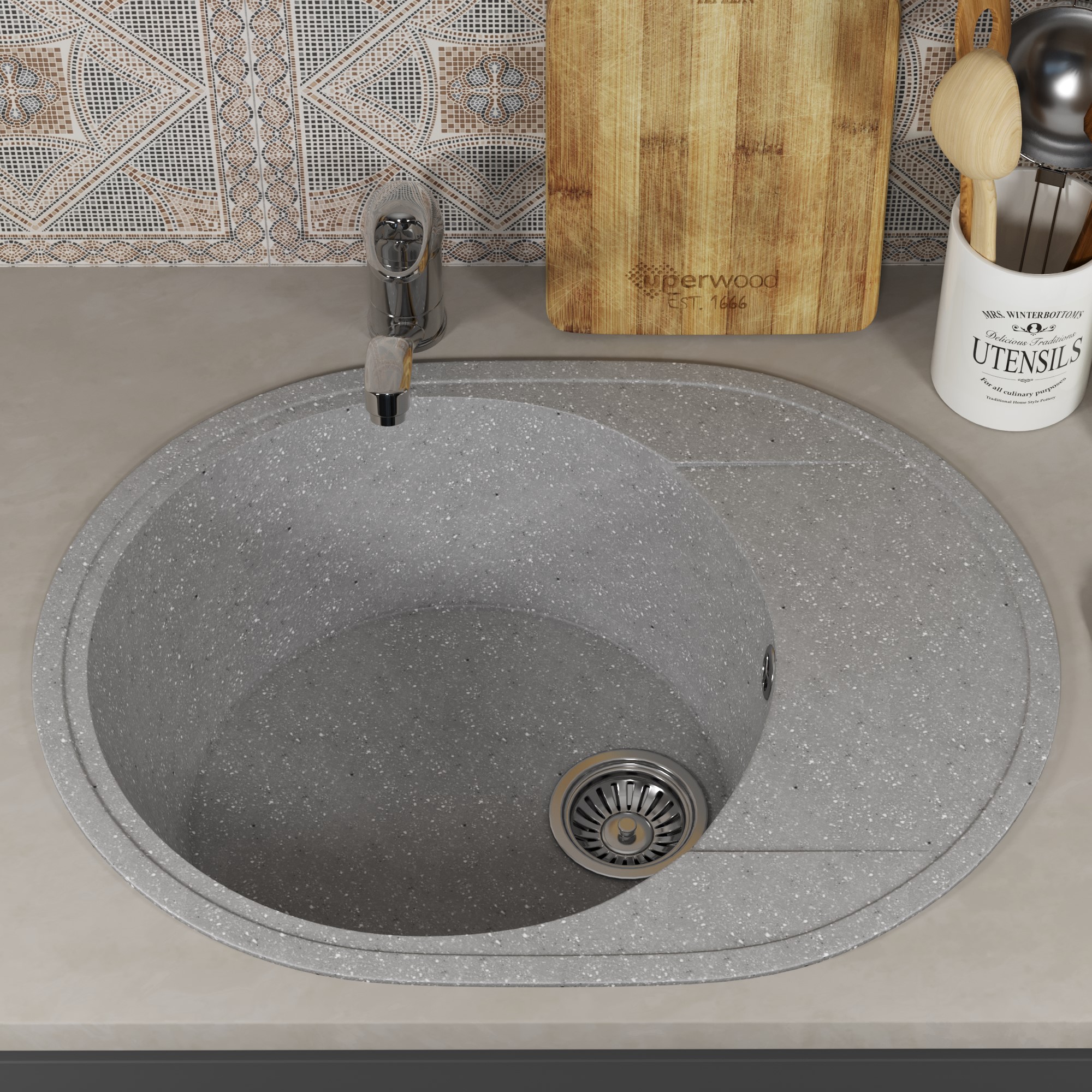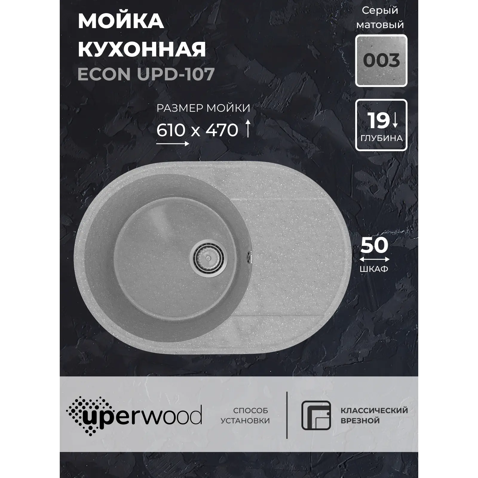 Кухонная мойка из искусственного камня Uperwood ECON UPD-107-003, овальная, серая матовая