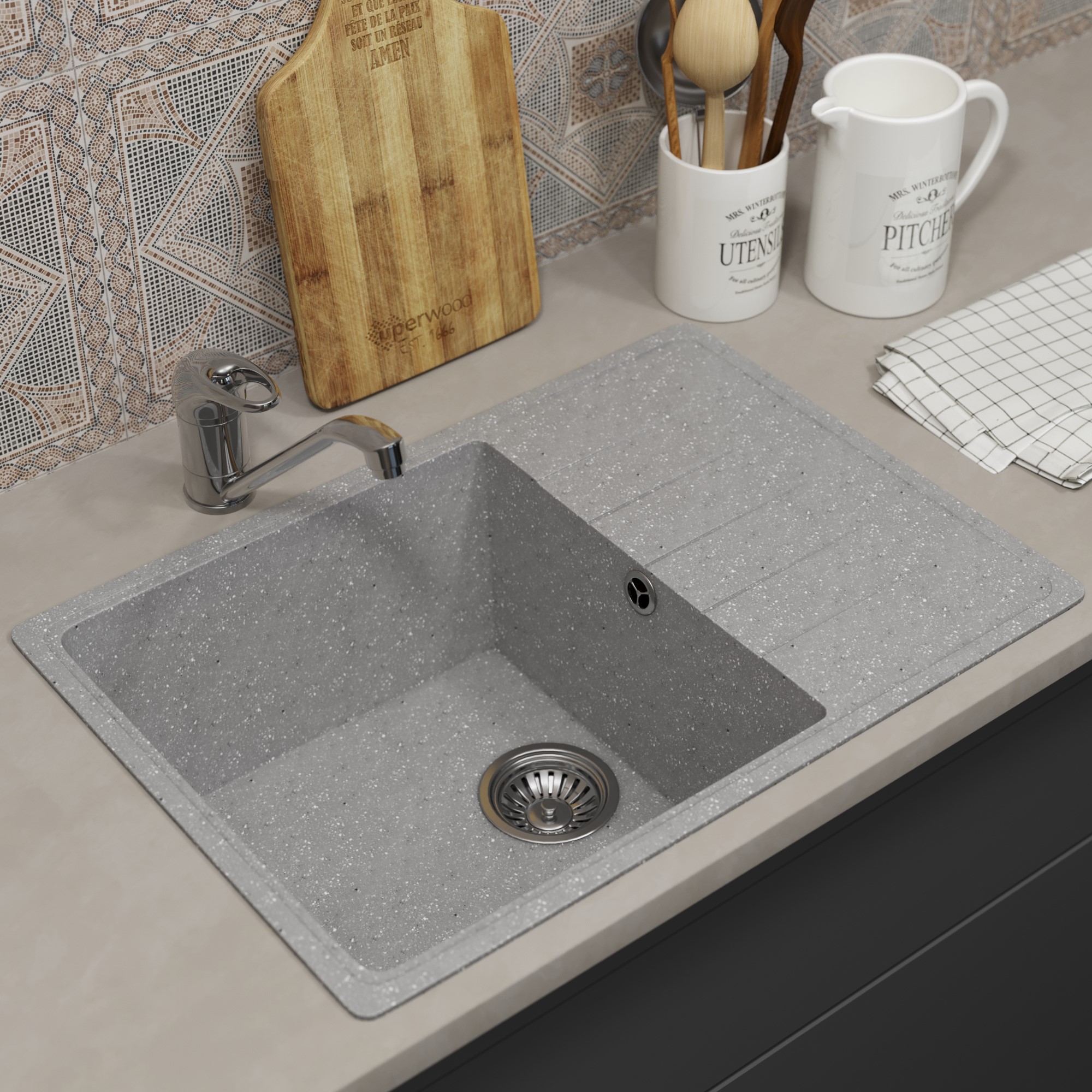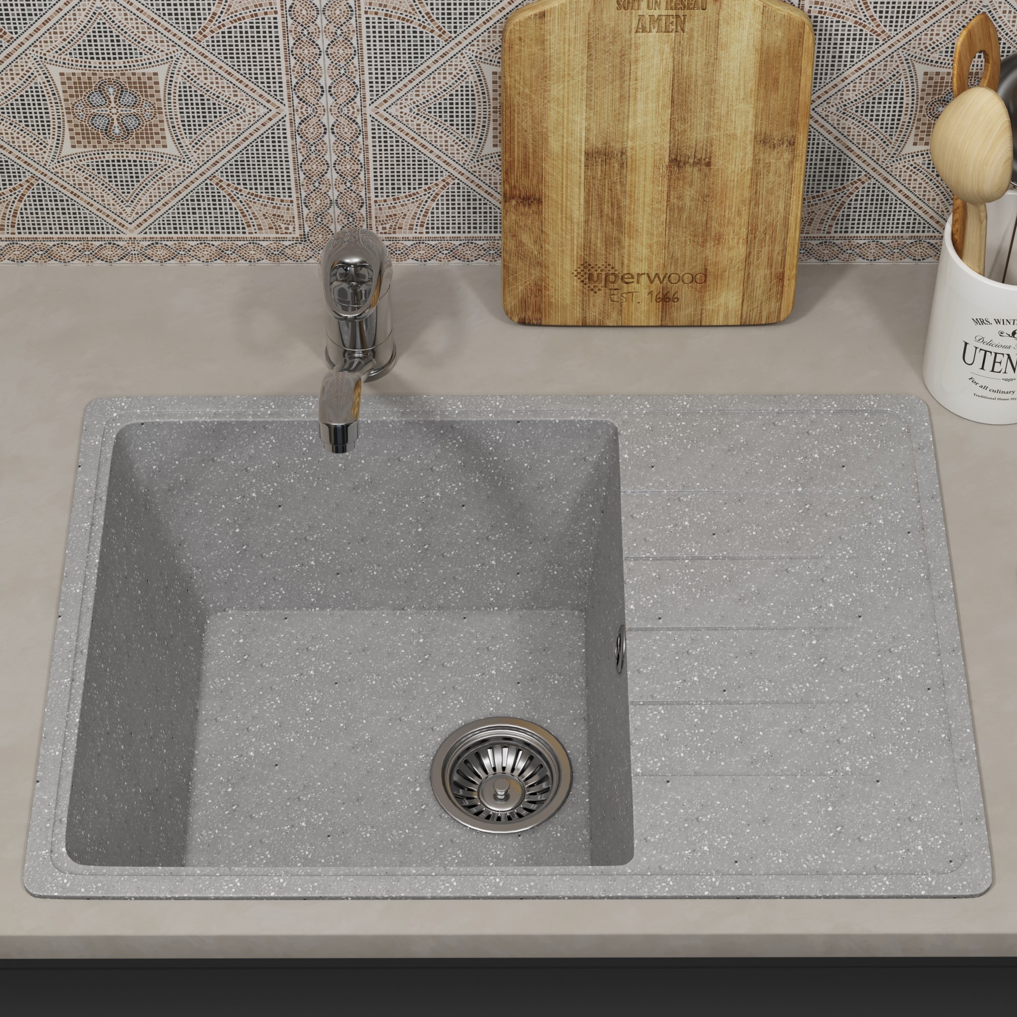 Кухонные мойки Uperwood из искусственного камня с увеличенной чашей отличаются своей практичностью, легкостью в уходе и увеличенным сроком службы по сравнению с керамикой и нержавеющей сталью. Уникальная фактура камня смотрится благородно, вписывается в любой интерьер и делает его утонченным.