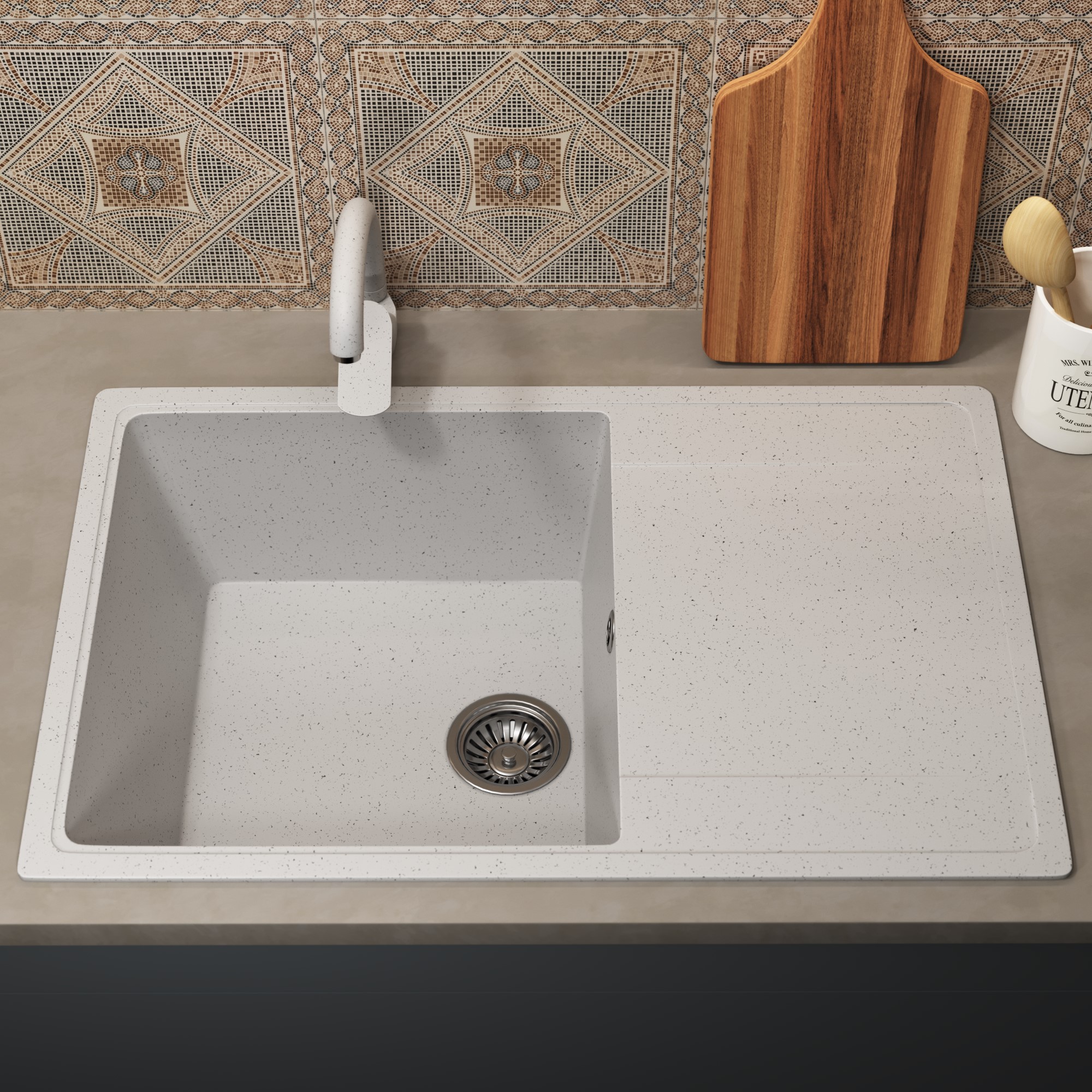 Уникальная фактура камня смотрится благородно, вписывается в любой интерьер и делает его утонченным. Мойка гладкая и приятная на ощупь, матовое покрытие. При эксплуатации не издает неприятного шума и грохота.