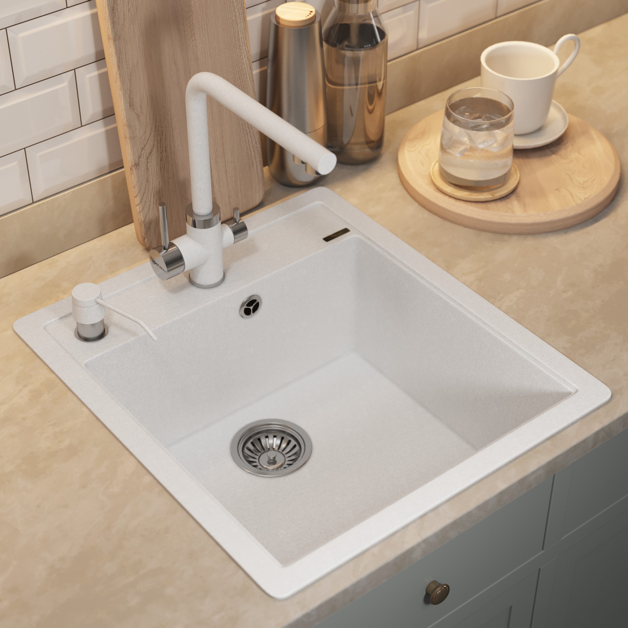 Мойка гладкая и приятная на ощупь, прочное матовое покрытие защищает мойку от любых внешних воздействий. При эксплуатации изделие не издает неприятного шума и грохота. Отверстие под смеситель отсутствует и вырезается на усмотрение покупателя в самой мойке или в столешнице. На выбор покупателя предлагается 4 универсальных цвета для каждой модели мойки: белый, серый, бежевый и черный.