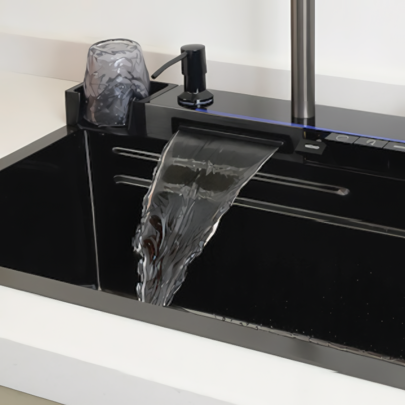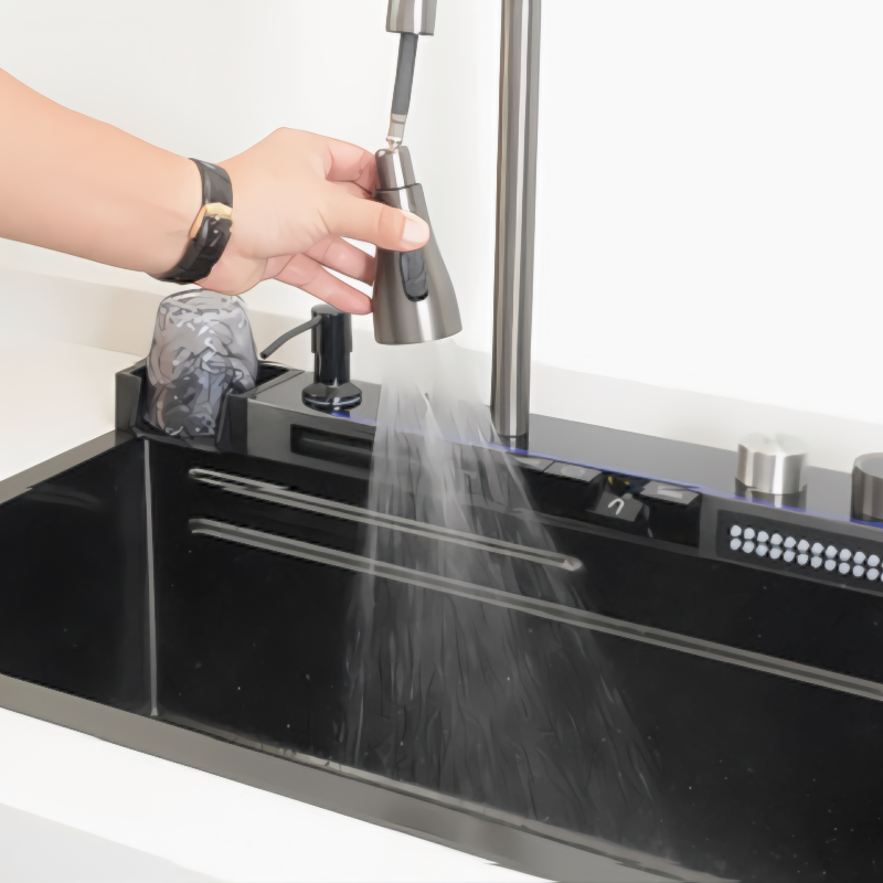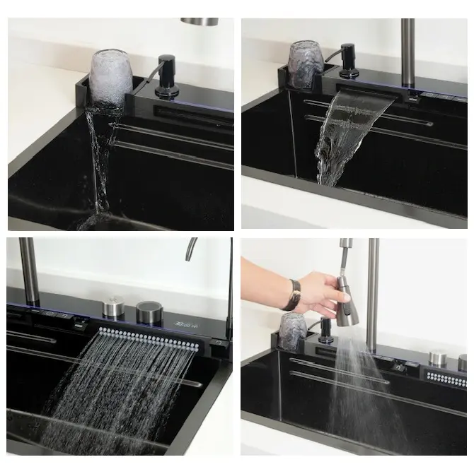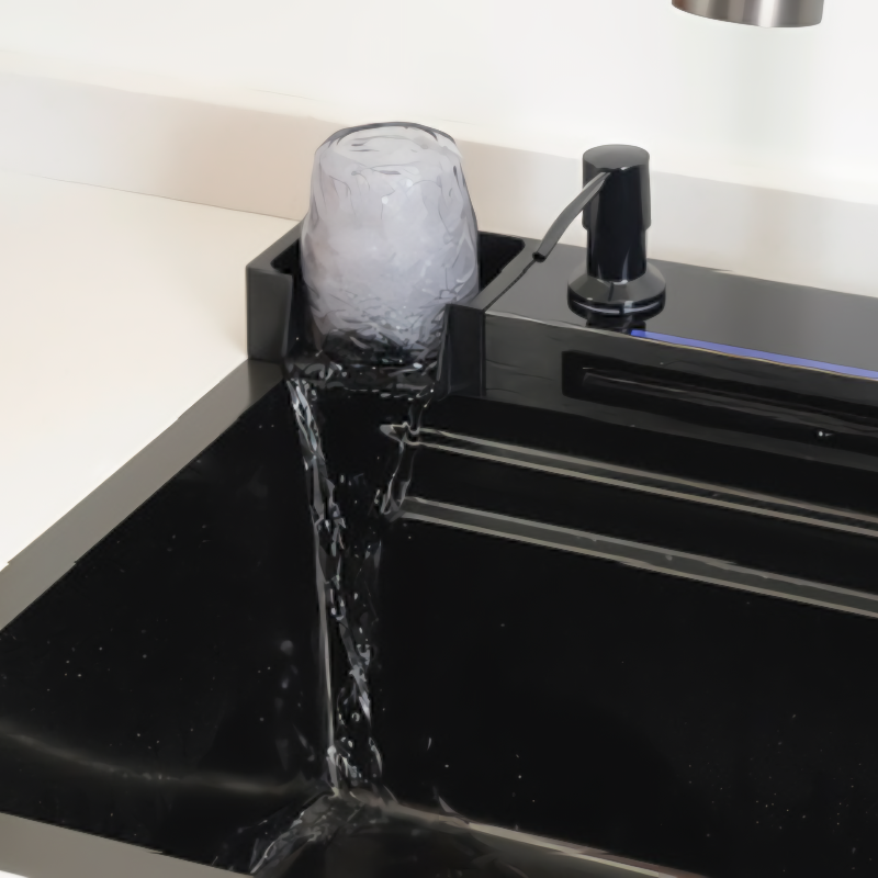 - На мойке есть 4 варианта подачи воды – смеситель/ каскадный водопад/ водопад/ мойка чашек (см видео). Режимы переключаются нажатием клавиши на панели.