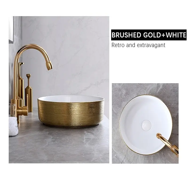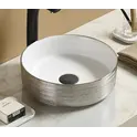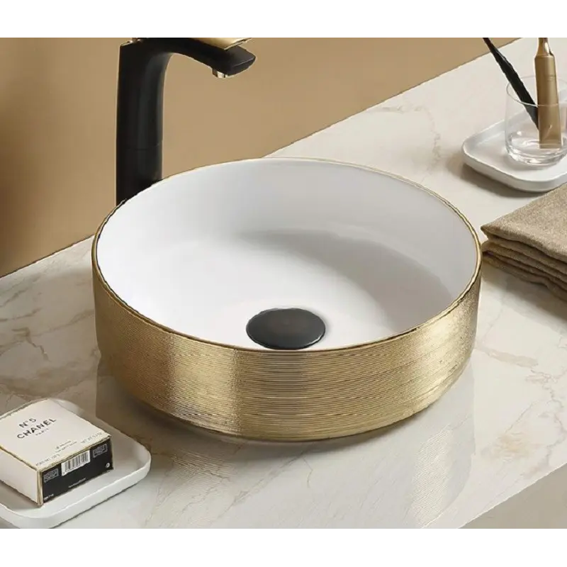 Фаянсовая, накладная. Устанавливается на столешницу. Диаметр слива: 45 мм