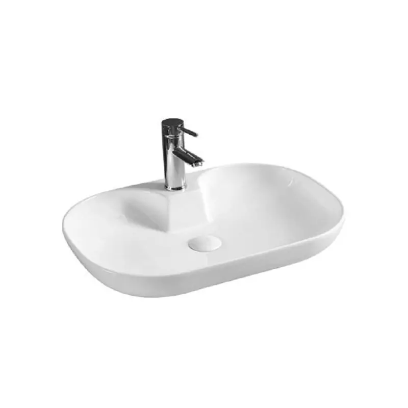 Фаянсовая, накладная. Устанавливается на столешницу. Диаметр слива: 45 мм