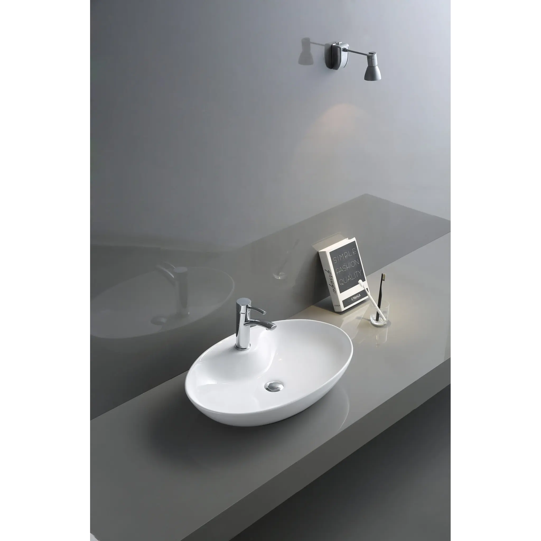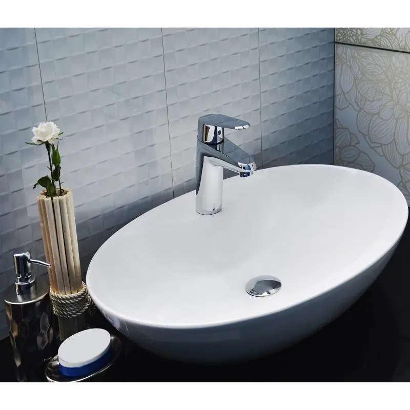Фаянсовая, накладная. Устанавливается на столешницу. Диаметр слива: 45 мм