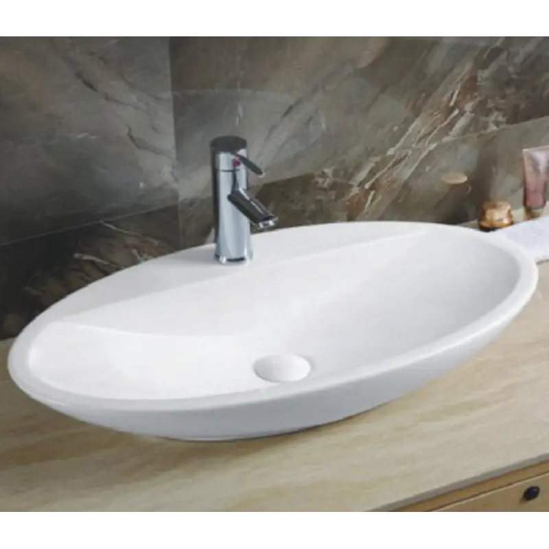 Фаянсовая, накладная. Устанавливается на столешницу. Диаметр слива: 45 мм