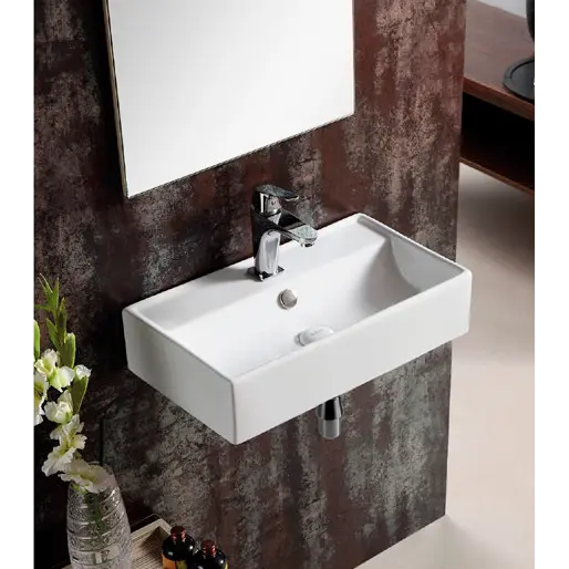 Фаянсовая, подвесная, накладная. Крепится на стену, устанавливается на столешницу, на тумбу. Диаметр слива: 45 мм
