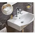 Фаянсовая, подвесная, накладная. Крепится на стену, устанавливается на столешницу, на тумбу. Диаметр слива: 45 мм
