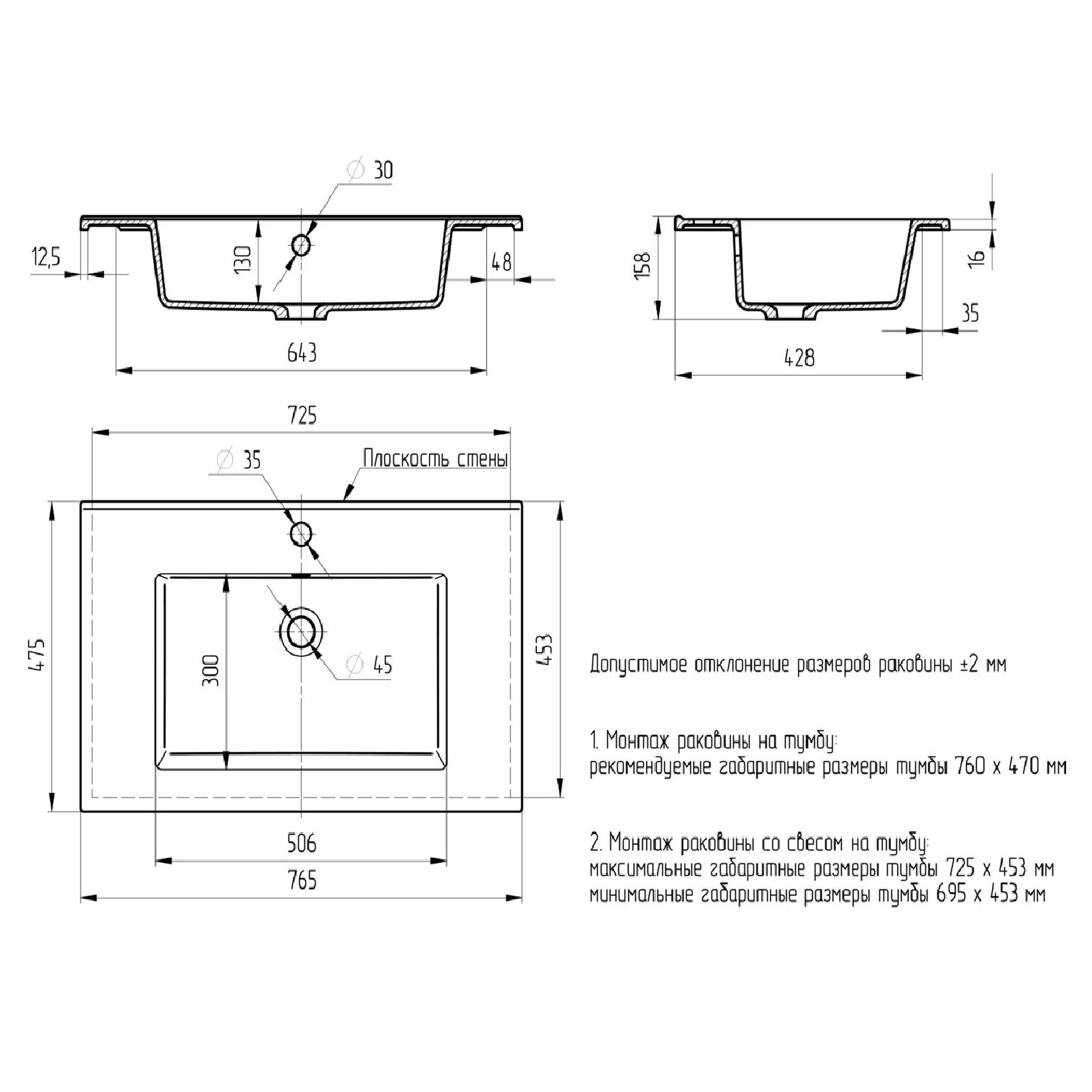 Раковина НЕ ПРЕДНАЗНАЧЕНА для установки на столешницу.