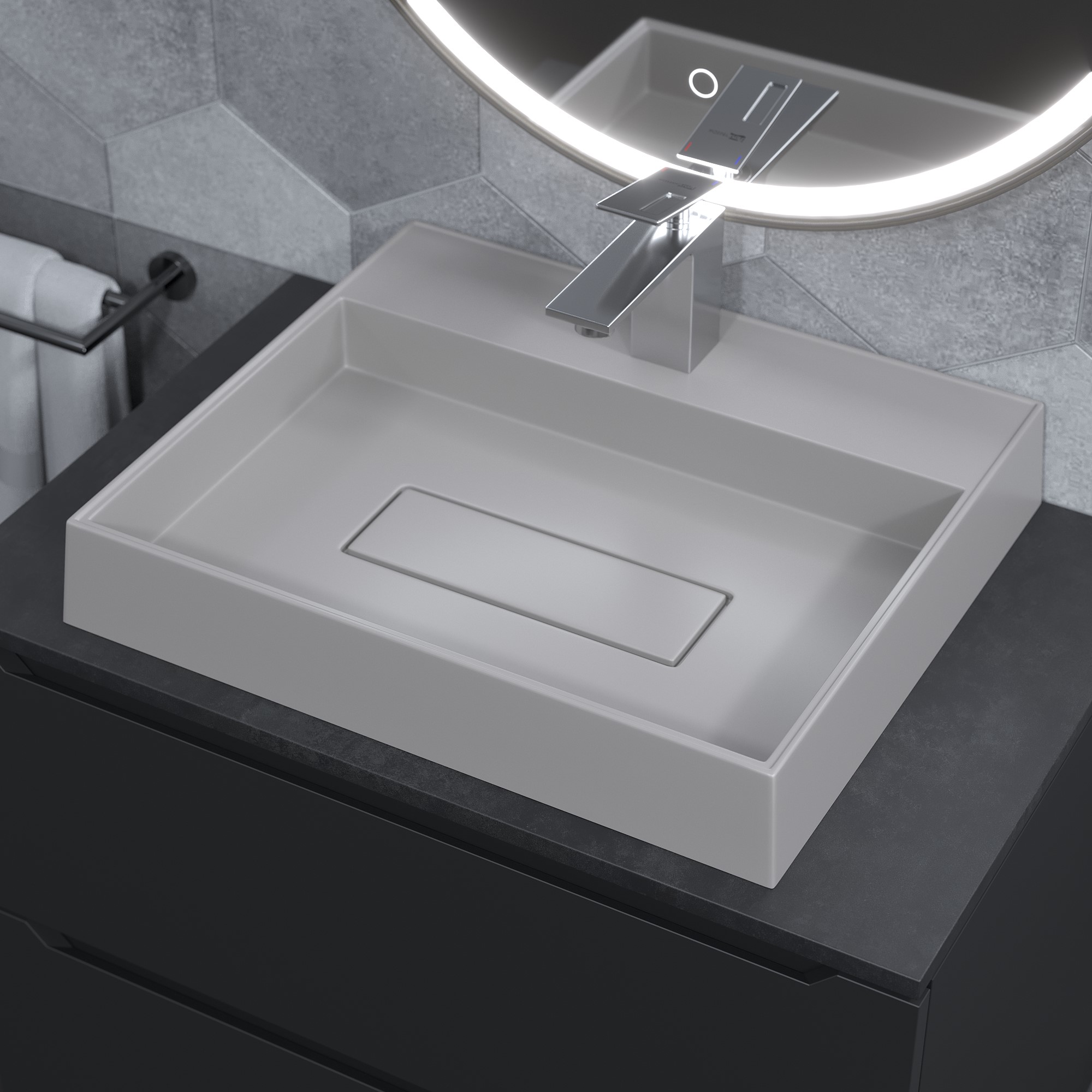Раковины Tanos Quartz имеют отверстие для установки смесителя и бортик для размещения ванных принадлежностей.
