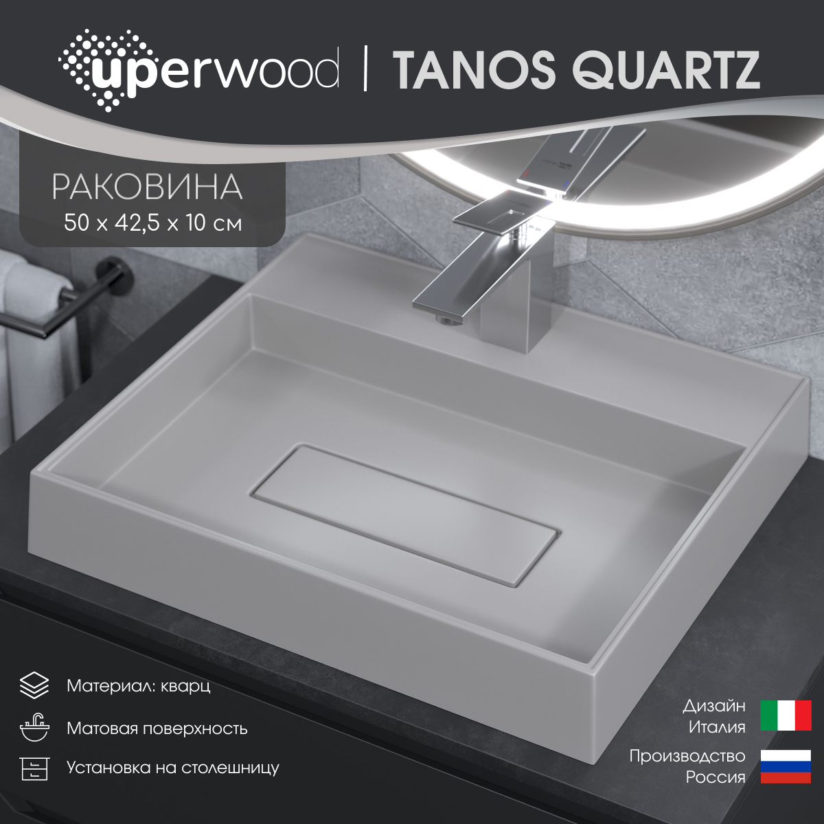 Накладные раковины для ванной комнаты от бренда Uperwood из коллекции Tanos Quartz изготовлены из кварцевого композита и предназначены для установки на столешницу.Особый состав этого материала делает раковину устойчивой к термическим воздействия и бытовым загрязнениям, придает высокую твердость, ударопрочность, стойкость к истиранию и царапинам.