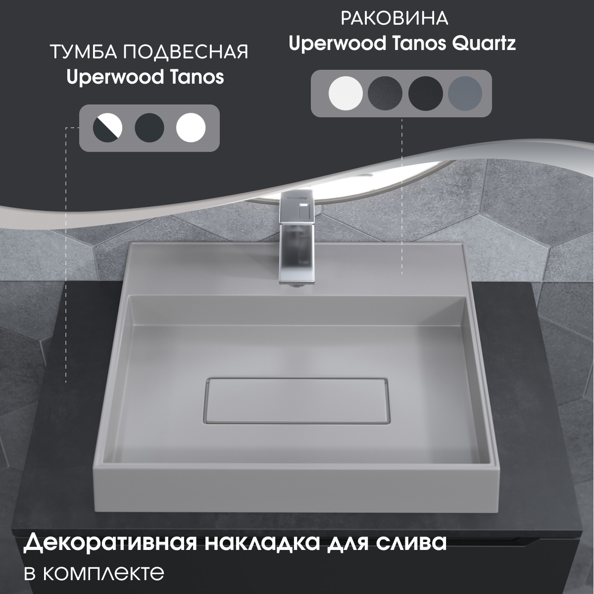 Для установки под раковины Tanos Quartz рекомендуем рассмотреть тумбы из коллекции Uperwood Tanos шириной от 60 см.