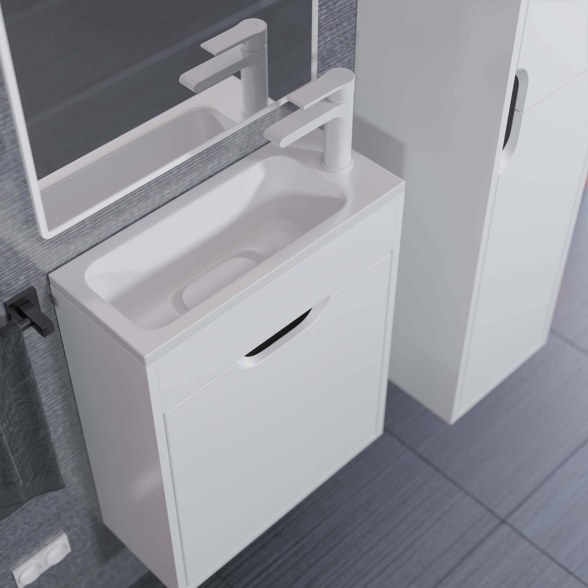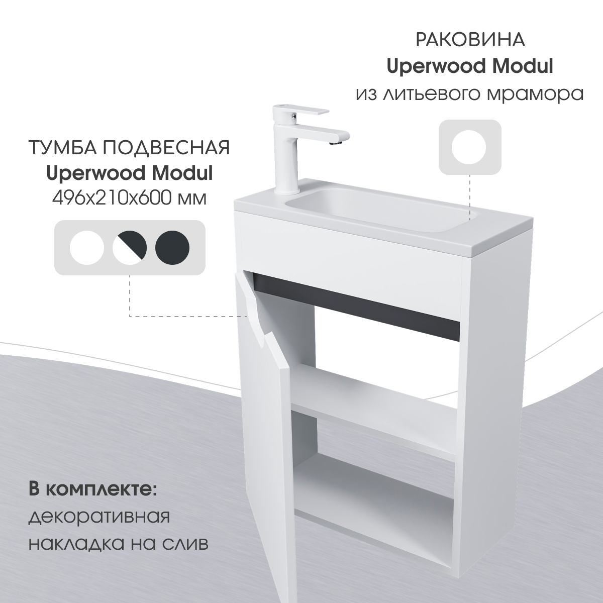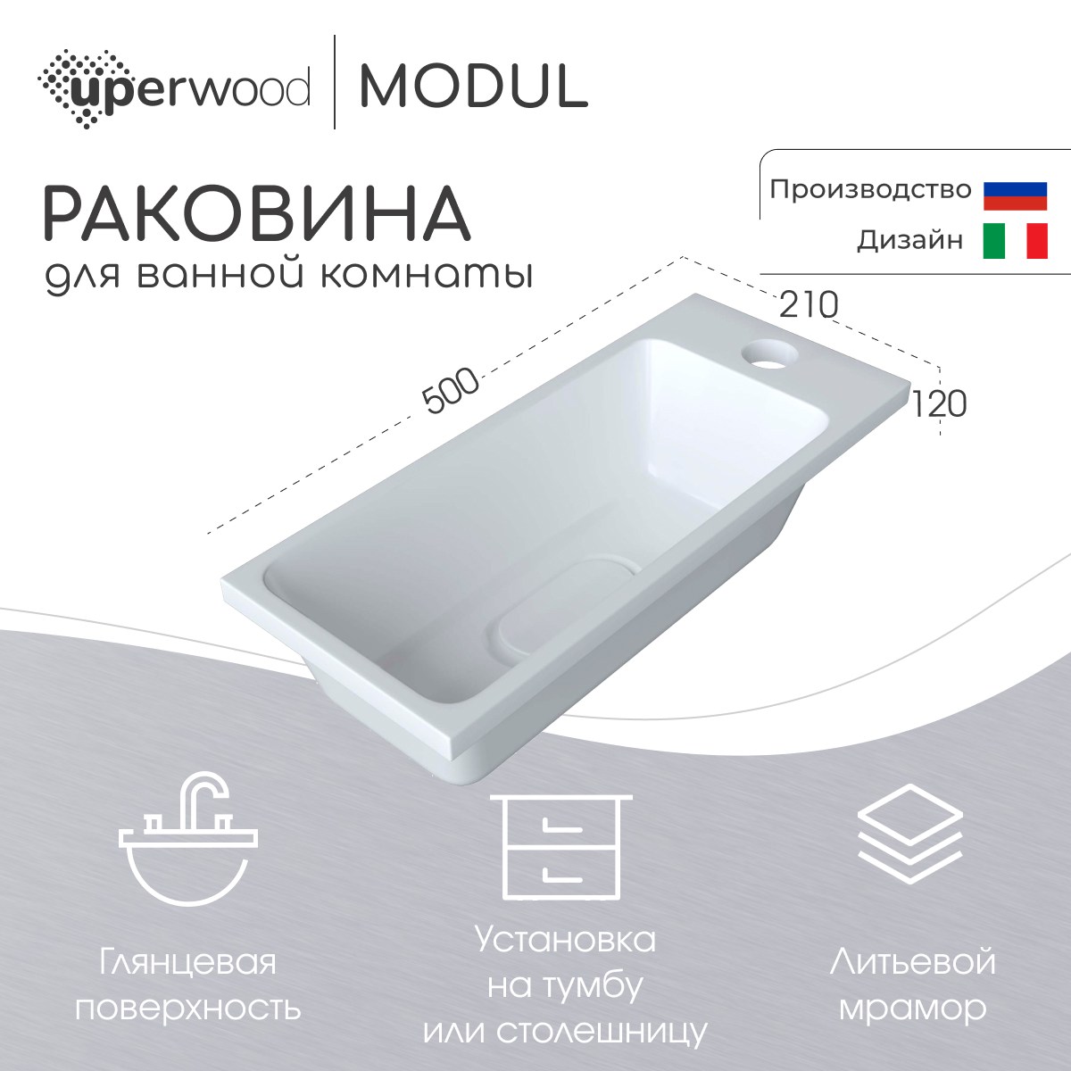 Белая глянцевая раковина Uperwood Modul (500 х 210 х 120 мм) предназначена для установки на подвесные тумбы из коллекции Uperwood Modul с распашной дверцей шириной 496 х 210 х 600 мм: