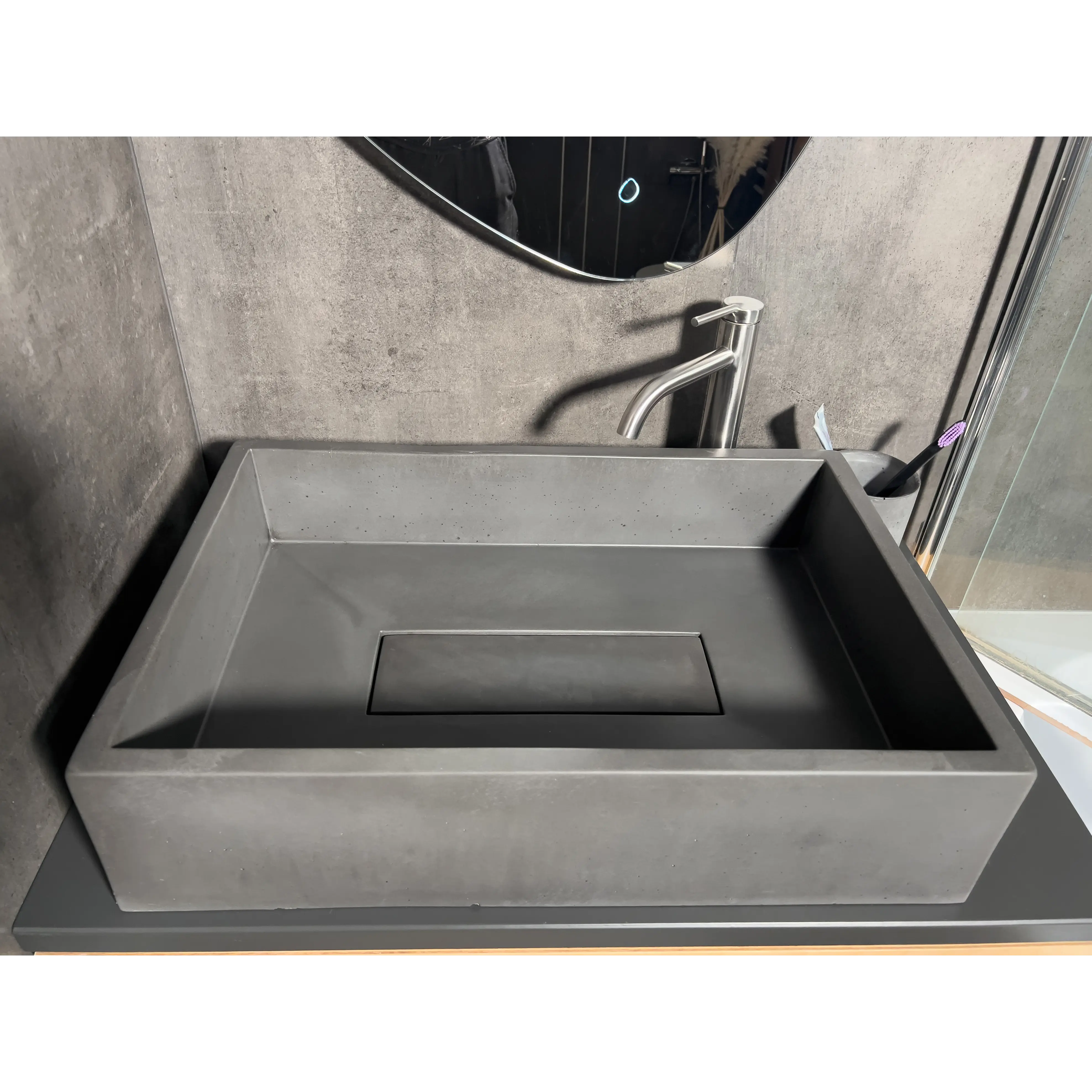 Раковина для ванной комнаты накладная, бетонная Uperwood Angkor 60 см, прямоугольная, графит, на тумбу, мойка, умывальник для туалета.Умывальник на столешнице популярен своей абсолютной простотой и чистой формой, сочетающей бетон с прямыми углами. Минималистский, вневременной и функциональный выбор, который удивит вас очень тонкими стенами и простотой обслуживания.Раковина смотрится очень оригинально благодаря закрытому сливу.Как и любая другая бетонная раковина, изготовленная вручную, имеет уникальную фактуру и цветовые оттенки.