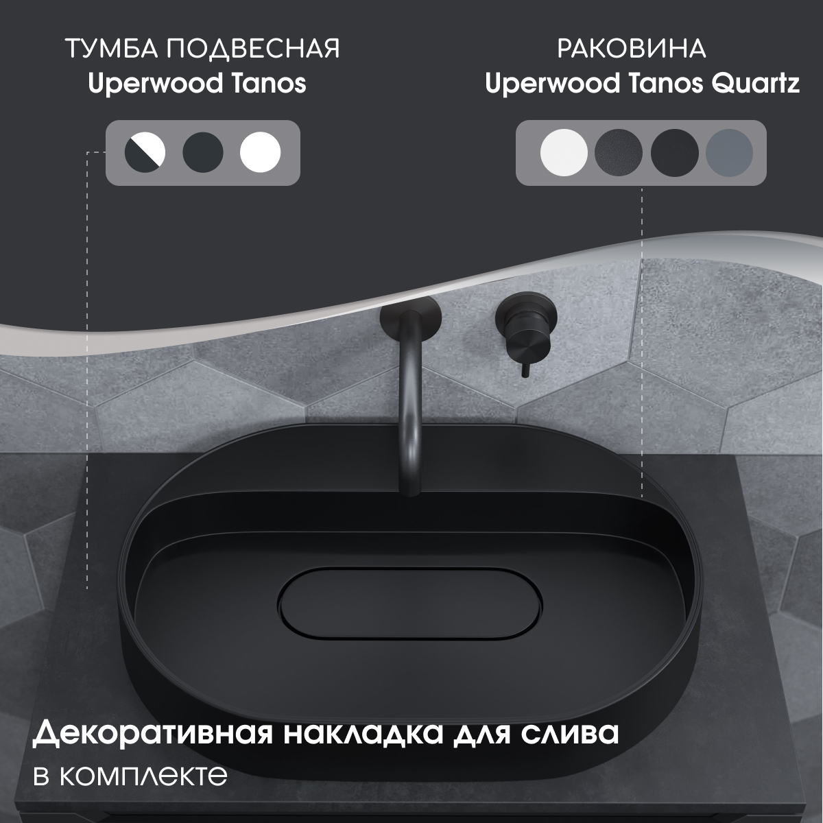 Для установки под раковины Tanos Quartz рекомендуем рассмотреть тумбы из коллекции Uperwood Tanos шириной от 60 см. Дополнительно потребуется приобрести столешницу, подходящую к габаритам изделий.