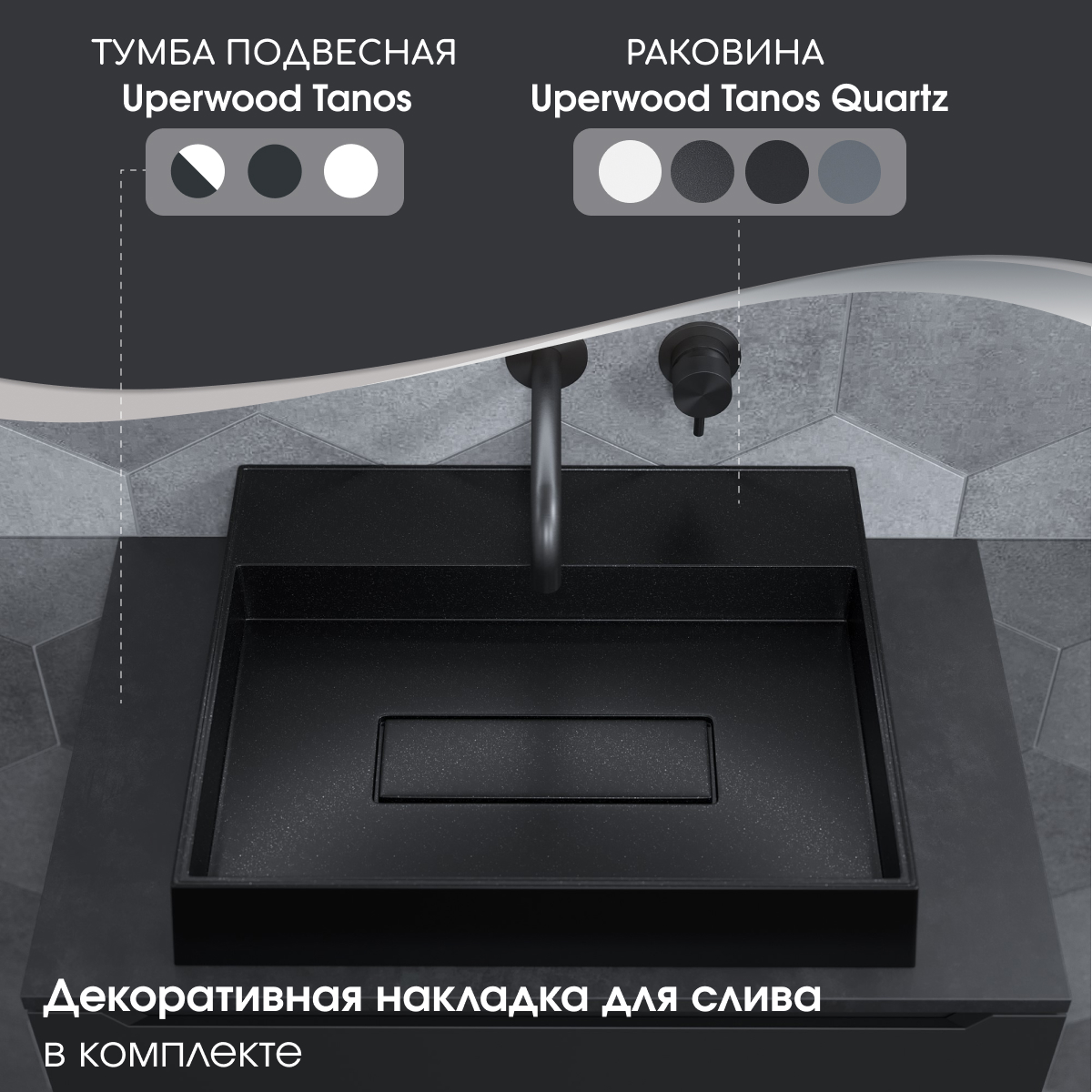 Для установки под раковины Tanos Quartz рекомендуем рассмотреть тумбы из коллекции Uperwood Tanos шириной от 60 см. Дополнительно потребуется приобрести столешницу, подходящую к габаритам изделий.