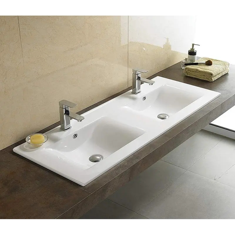 Фаянсовая. Слив-перелив в комплекте. Встраиваемая сверху, многосекционная. Устанавливается на столешницу. Имеет 2 готовых отверстия под смеситель. Диаметр слива: 4.5 см