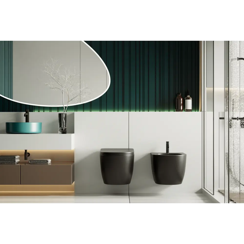 Комплект ABBER унитаз AC1100MB черный матовый с инсталляцией AC0105 и кнопкой , биде AC1150MB с инсталляцией AC0101P