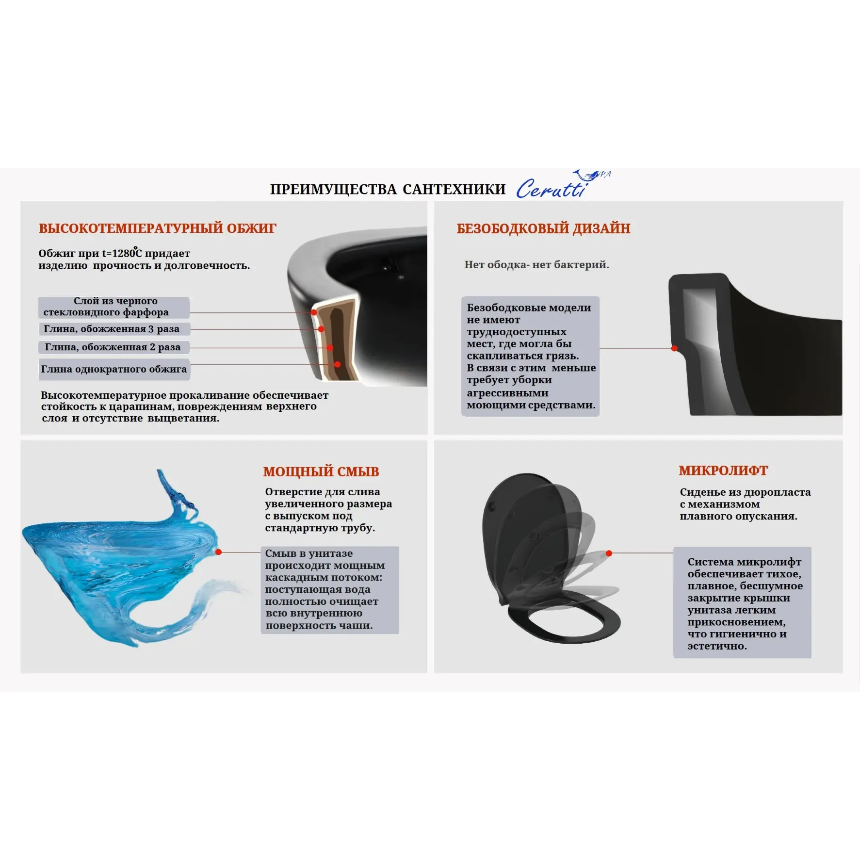 Черная матовая сантехника отличается от традиционной белой своей элегантностью и стильностью. Она привносит особый шарм в интерьер ванной комнаты и позволяет создать эффектный контраст с другими элементами дизайна. Черная сантехника — это не только красиво, но и функционально, так как она изготавливается из высококачественных материалов и более практична в уходе.Обычно качественные черные унитазы дороже, чем их более дешевые аналоги. Это связано с более сложным процессом технологии обжига, окрашивания и обработки поверхности изделий. У дорогого унитаза глазурь имеет более толстый защитный слой, а также лучшие параметры шероховатости покрытия. Такой унитаз дольше сохраняет цвет, имеет стойкость к сколам и трещинам. У более дешевых черных унитазов вместо качественной глазури используется специальная плёнка. Такое изделие придётся заменить через два — три года или жить с унитазом, на котором останутся не оттираемые следы, въевшиеся в керамику.В производстве черных унитазов Ceruttispa используется качественная глина черного цвета. В ходе производства сырье тщательно измельчают, просеивают, добиваясь максимального коэффициента плотности состава. Изделие покрывают глазурью и применяют однократный обжиг при температуре 1280 градусов. Спекание частиц мельчайших размеров позволяет получить идеально гладкую поверхность с эффектом стекла. Благодаря этому достигается высокая степень прочности и долговечности, они рассчитаны на сроки эксплуатации свыше 30 лет. Модели с покрытием из стекловидной эмали надежно защищены не только от влаги или загрязнений, но и от бактерий, что делает их более практичными в уходе. Поверхность унитаза устойчива к выцветанию и к случайным царапинам, для удаления которых можно просто протереть поверхность увлажненной салфеткой.В комплекте присутствует легкосъемное сидение с крышкой, оснащенное системой микролифт (для плавного и бесшумного опускания). Крепление к чаше выполнены из стали, а само сидение — из долговечного полимерного материала дюропласт с антибактериальным покрытием. Снятие осуществляется одним нажатием кнопки. Каскадная система слива омывает всю внутреннюю поверхность чаши, что обеспечивает качественное очищение.Внимание! Производитель оставляет за собой право вносить изменения в конструкцию и комплектацию моделей без предварительного уведомления!
