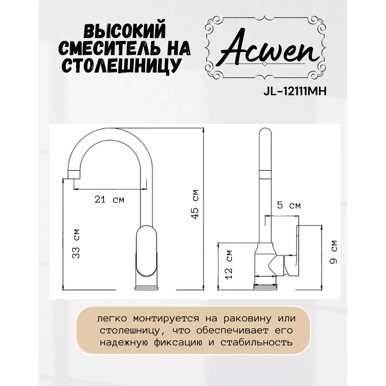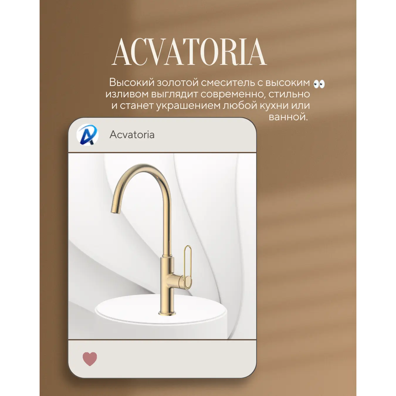 Высокий золотой смеситель с высоким изливом выглядит современно, стильно и станет украшением любой кухни или ванной. Цвет золота это классика, уверенно набирающая популярность - выглядит дорого, стильно, а покрытие более устойчиво к загрязнению (в сравнение с хромированным покрытием - минимум вдвое).