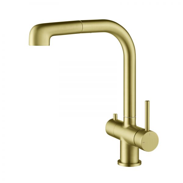Цвет "матовое золото" никогда не выйдет из моды, во все времена драгоценный металл был признаком богатства. Смеситель Timo Saona 2346 с выдвижной лейкой и системой подключения фильтрованной воды относится к премиальному сегменту, предназначен для монтажа на кухонную мойку или столешницу. Высокий излив подходит для моек с двумя чашами, а также позволяет справляться с мытьем габаритной посуды.
